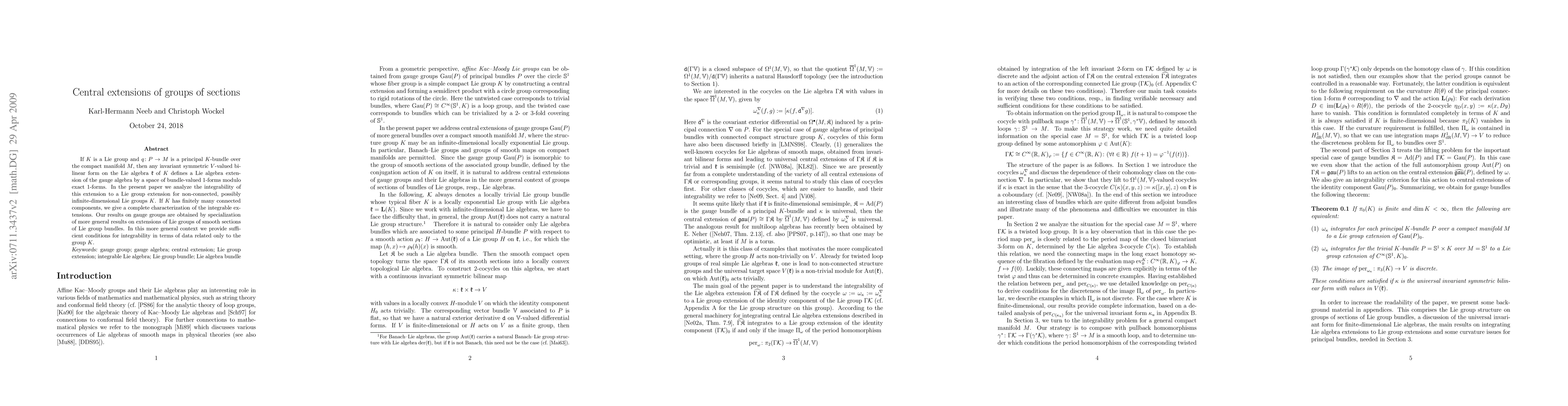 If q : P -> M is a principal K-bundle over the compact manifold M, then any invariant symmetric V-valued bilinear form on the Lie algebra k of K defines a Lie algebra extension of the gauge algebra by a space of bundle-valued 1-forms modulo exact forms. In the present paper we analyze the integrability of this extension to a Lie group extension for non-connected, possibly infinite-dimensional Lie groups K. If K has finitely many connected components we give a complete characterization of the integrable extensions. Our results on gauge groups are obtained by specialization of more general results on extensions of Lie groups of smooth sections of Lie group bundles. In this more general context we provide sufficient conditions for integrability in terms of data related only to the group K.