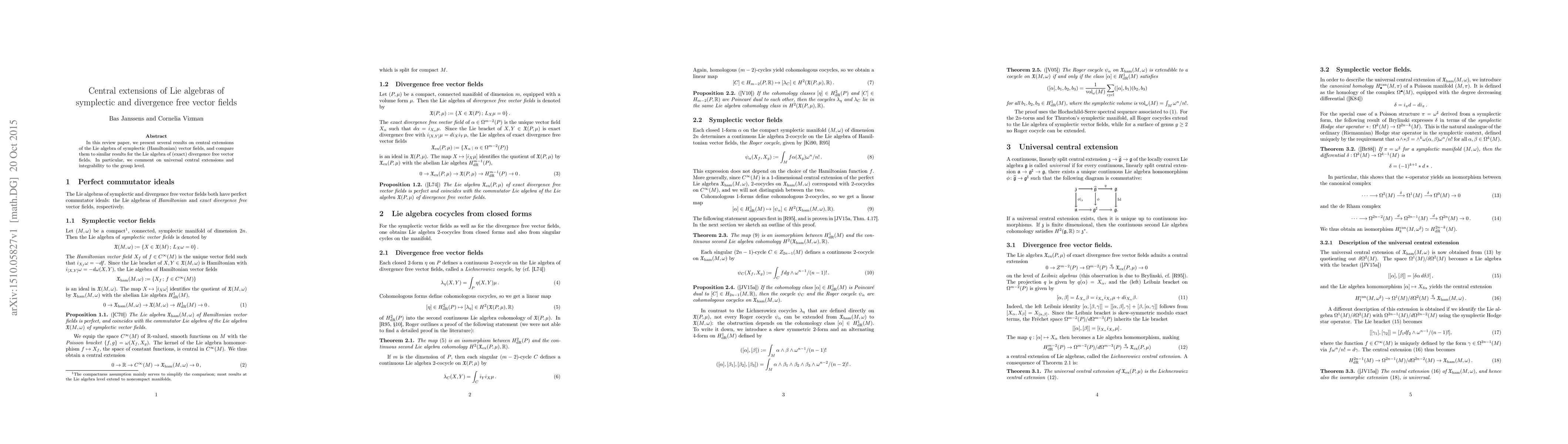 Summary: This review discusses central extensions of the Lie algebra of symplectic vector fields and compares them with those of divergence-free vector fields, focusing on universal central extensions and their connection to group-level integrability.