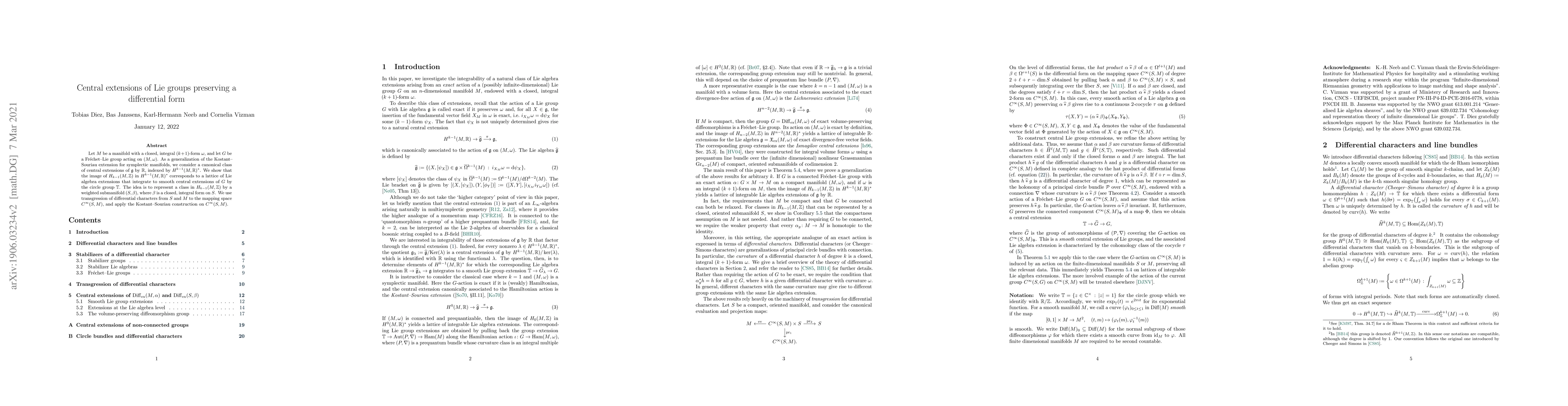 Let $M$ be a manifold with a closed, integral $(k+1)$-form $\omega$, and let $G$ be a Fr\'echet-Lie group acting on $(M,\omega)$. As a generalization of the Kostant-Souriau extension for symplectic manifolds, we consider a canonical class of central extensions of $\mathfrak{g}$ by $\mathbb{R}$, indexed by $H^{k-1}(M,\mathbb{R})^*$. We show that the image of $H_{k-1}(M,\mathbb{Z})$ in $H^{k-1}(M,\mathbb{R})^*$ corresponds to a lattice of Lie algebra extensions that integrate to smooth central extensions of $G$ by the circle group $\mathbb{T}$. The idea is to represent a class in $H_{k-1}(M,\mathbb{Z})$ by a weighted submanifold $(S,\beta)$, where $\beta$ is a closed, integral form on $S$. We use transgression of differential characters from $S$ and $ M $ to the mapping space $ C^\infty(S, M) $, and apply the Kostant-Souriau construction on $ C^\infty(S, M) $.