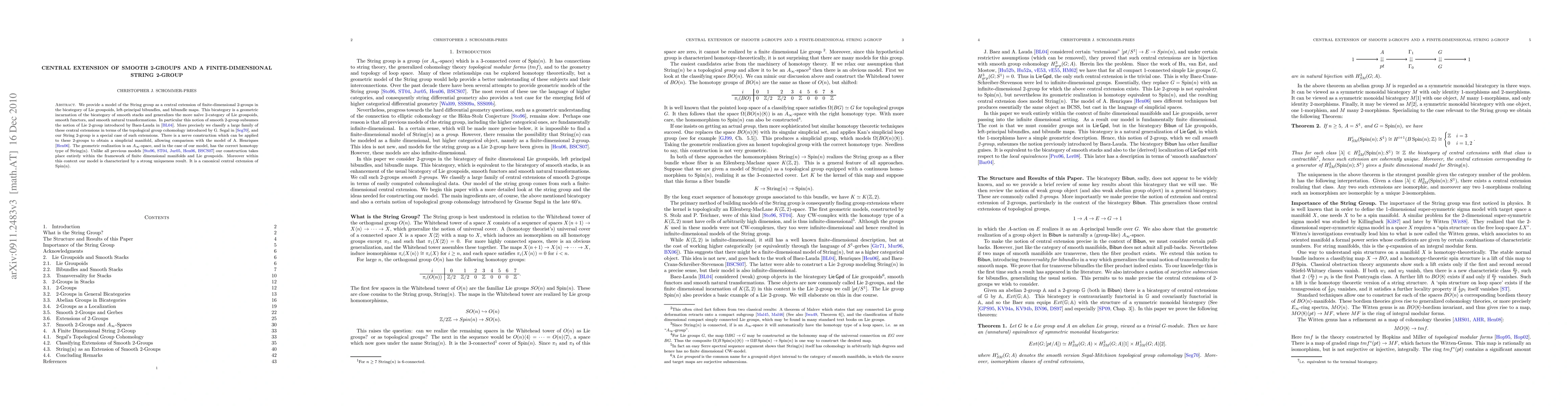 We provide a model of the String group as a central extension of finite-dimensional 2-groups in the bicategory of Lie groupoids, left-principal bibundles, and bibundle maps. This bicategory is a geometric incarnation of the bicategory of smooth stacks and generalizes the more na\"ive 2-category of Lie groupoids, smooth functors, and smooth natural transformations. In particular this notion of smooth 2-group subsumes the notion of Lie 2-group introduced by Baez-Lauda. More precisely we classify a large family of these central extensions in terms of the topological group cohomology introduced by G. Segal, and our String 2-group is a special case of such extensions. There is a nerve construction which can be applied to these 2-groups to obtain a simplicial manifold, allowing comparison with with the model of A. Henriques. The geometric realization is an $A_\infty$-space, and in the case of our model, has the correct homotopy type of String(n). Unlike all previous models our construction takes place entirely within the framework of finite dimensional manifolds and Lie groupoids. Moreover within this context our model is characterized by a strong uniqueness result. It is a unique central extension of Spin(n).