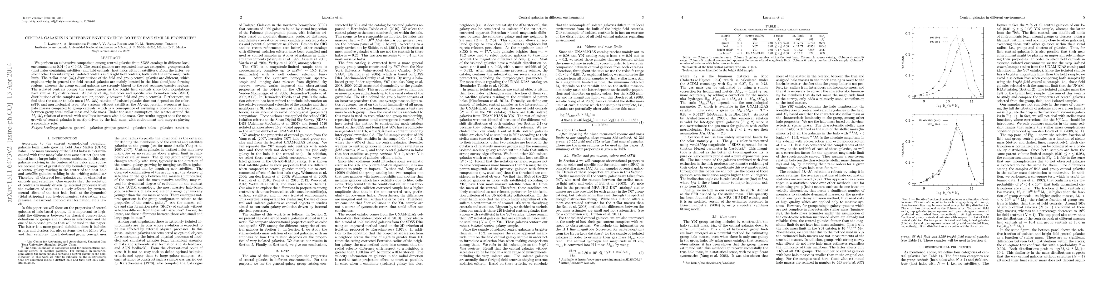 A study compares central galaxies in different environments and finds that their properties, such as stellar mass and color, are similar despite being in different regions of the universe.