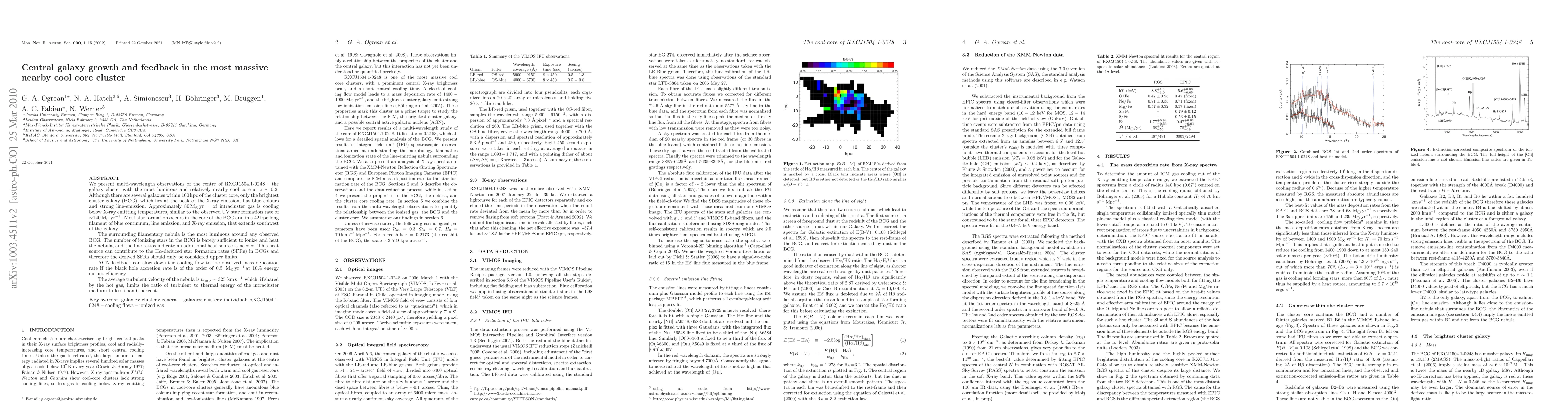 We present multi-wavelength observations of the centre of RXCJ1504.1-0248 - the galaxy cluster with the most luminous and relatively nearby cool core at z~0.2. Although there are several galaxies within 100 kpc of the cluster core, only the brightest cluster galaxy (BCG), which lies at the peak of the X-ray emission, has blue colours and strong line-emission. Approximately 80 Msun/yr of intracluster gas is cooling below X-ray emitting temperatures, similar to the observed UV star formation rate of ~140 Msun/yr. Most star formation occurs in the core of the BCG and in a 42 kpc long filament of blue continuum, line emission, and X-ray emission, that extends southwest of the galaxy. The surrounding filamentary nebula is the most luminous around any observed BCG. The number of ionizing stars in the BCG is barely sufficient to ionize and heat the nebula, and the line ratios indicate an additional heat source is needed. This heat source can contribute to the H\alpha-deduced star formation rates (SFRs) in BCGs and therefore the derived SFRs should only be considered upper limits. AGN feedback can slow down the cooling flow to the observed mass deposition rate if the black hole accretion rate is of the order of 0.5 Msun/yr at 10% energy output efficiency. The average turbulent velocity of the nebula is vturb ~325 km/s which, if shared by the hot gas, limits the ratio of turbulent to thermal energy of the intracluster medium to less than 6%.