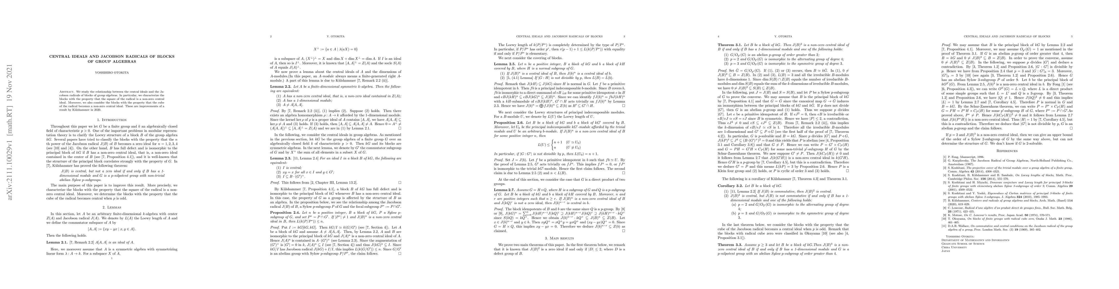 This research examines the connection between central ideals and Jacobson radicals in blocks of group algebras, identifying blocks where the radical's square or cube is a non-zero central ideal.