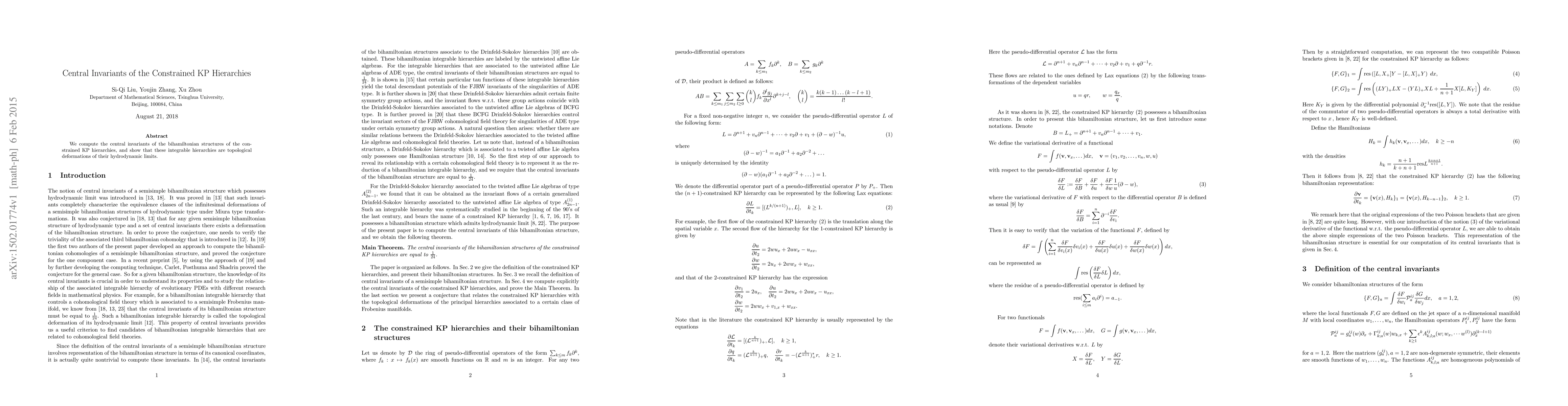 Summary: This paper calculates the central invariants of bihamiltonian structures in constrained KP hierarchies, demonstrating that these integrable systems are topologically equivalent to their hydrodynamic limits.