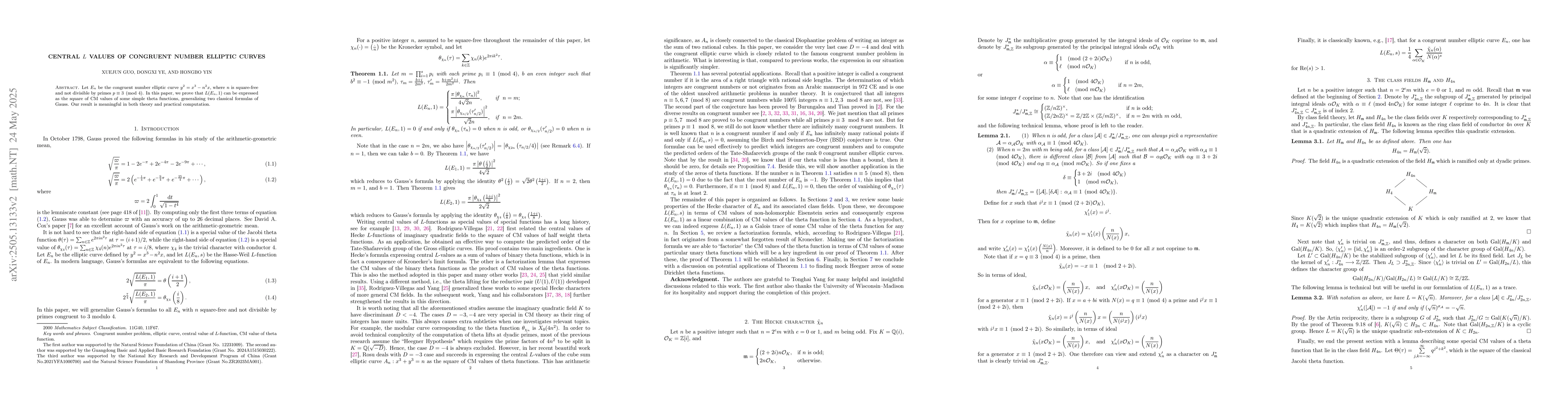 Researchers prove a general formula for central L values of congruent number elliptic curves, linking them to simple theta functions and building on Gauss's classical formulas.