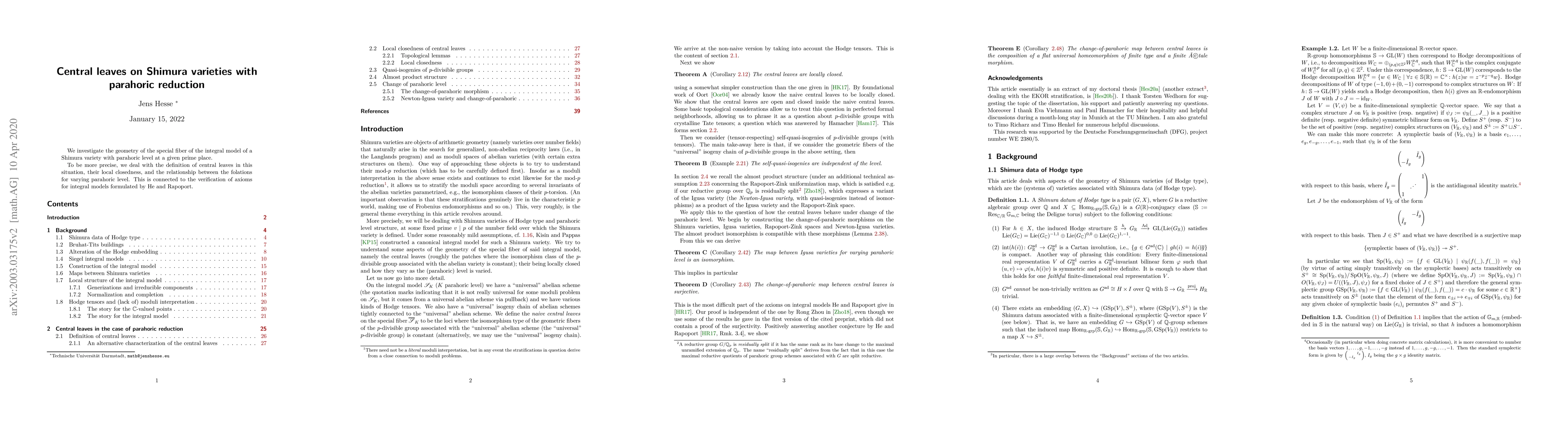 This paper explores the geometry of the special fiber of an integral Shimura variety with parahoric level at a specific prime, focusing on the definition and properties of central leaves, their local closedness, and the connections between folations at different parahoric levels, in relation to axioms verified by He and Rapoport.