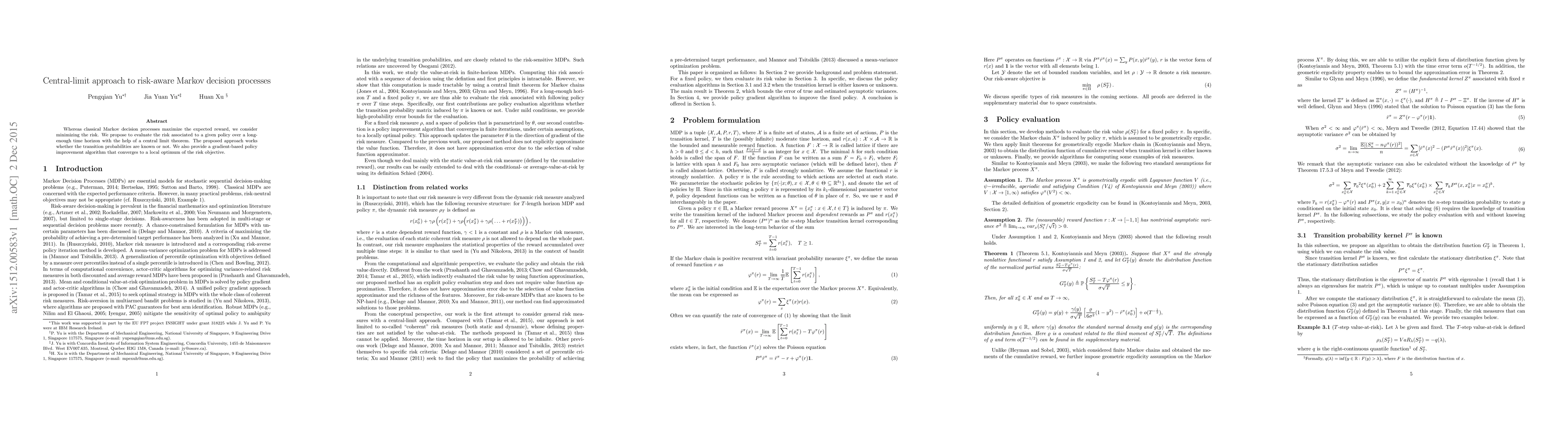 This paper proposes a central-limit approach to minimize risk in Markov decision processes, evaluating risk over long horizons using a central limit theorem. It also introduces a gradient-based algorithm for policy improvement that converges to a local optimum of the risk objective.
