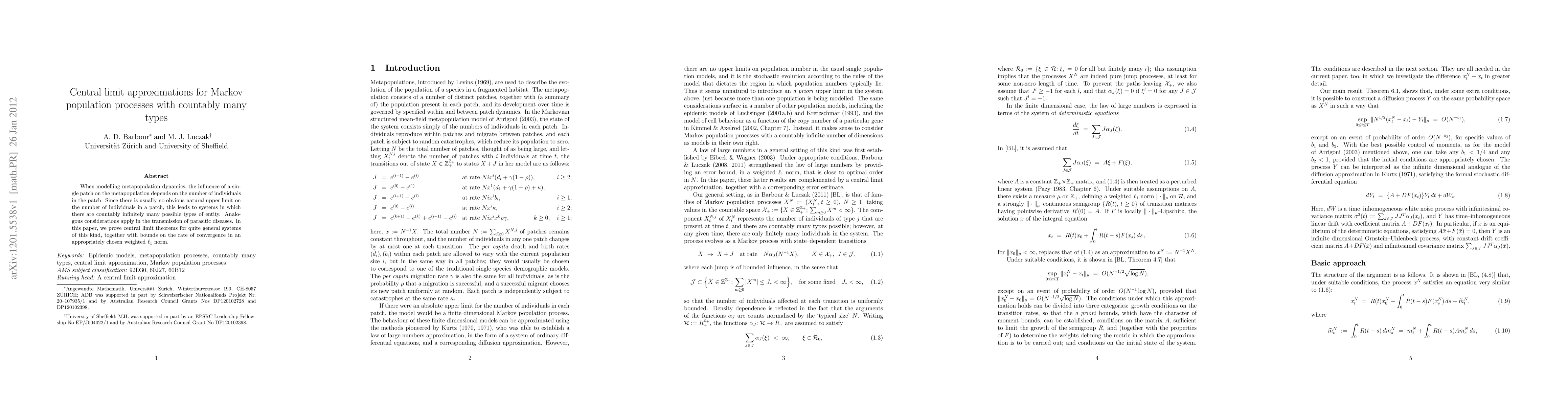 When modelling metapopulation dynamics, the influence of a single patch on the metapopulation depends on the number of individuals in the patch. Since there is usually no obvious natural upper limit on the number of individuals in a patch, this leads to systems in which there are countably infinitely many possible types of entity. Analogous considerations apply in the transmission of parasitic diseases. In this paper, we prove central limit theorems for quite general systems of this kind, together with bounds on the rate of convergence in an appropriately chosen weighted $\ell_1$ norm.