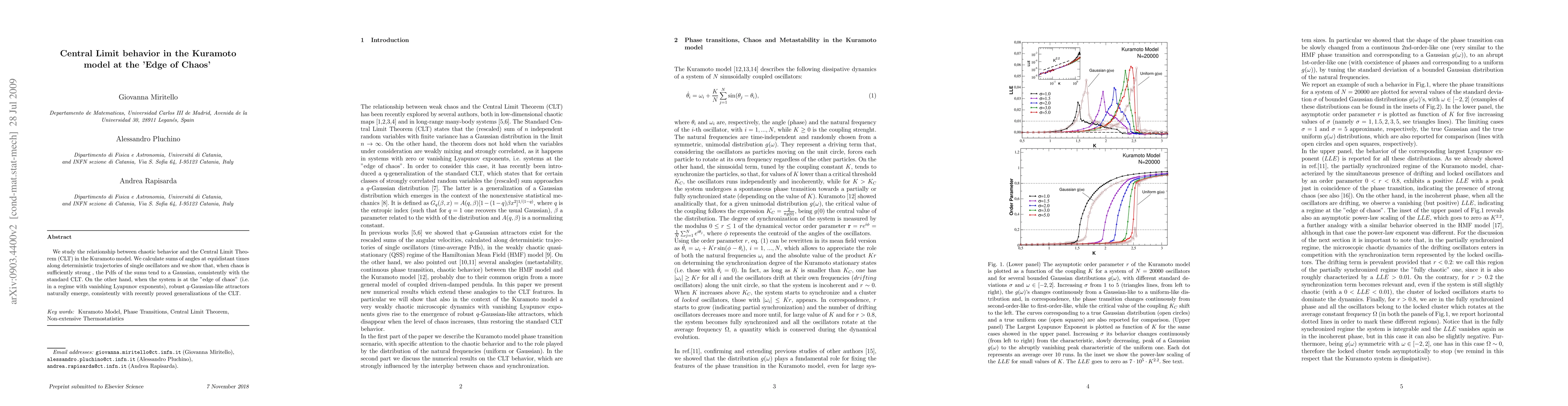 We study the relationship between chaotic behavior and the Central Limit Theorem (CLT) in the Kuramoto model. We calculate sums of angles at equidistant times along deterministic trajectories of single oscillators and we show that, when chaos is sufficiently strong, the Pdfs of the sums tend to a Gaussian, consistently with the standard CLT. On the other hand, when the system is at the "edge of chaos" (i.e. in a regime with vanishing Lyapunov exponents), robust $q$-Gaussian-like attractors naturally emerge, consistently with recently proved generalizations of the CLT.