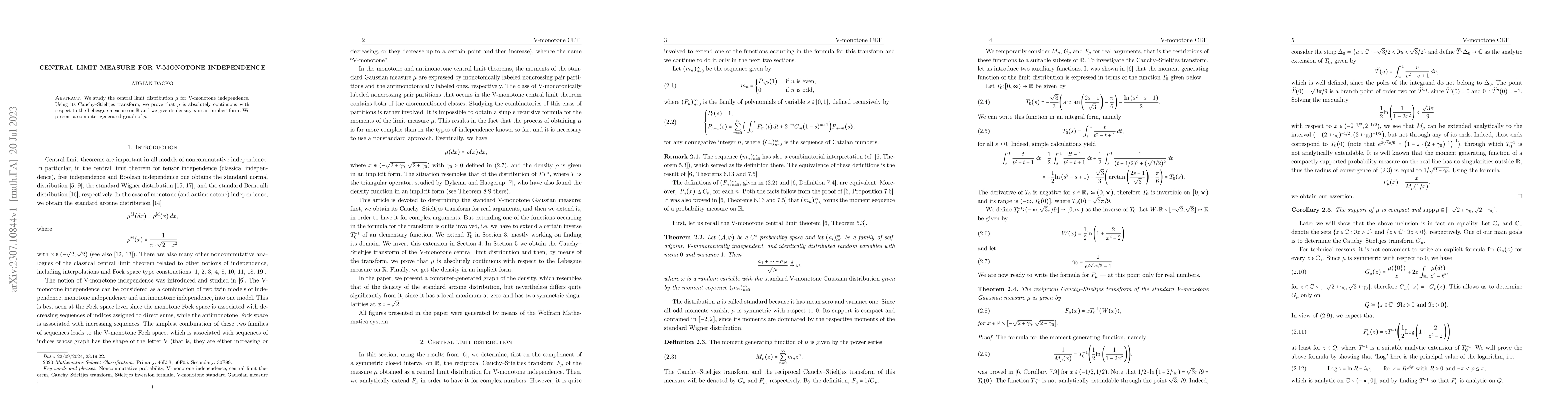 This paper explores the central limit distribution for V-monotone independence, proving its absolute continuity with respect to the Lebesgue measure and providing an implicit form for its density function, which is illustrated via a computer-generated graph.
