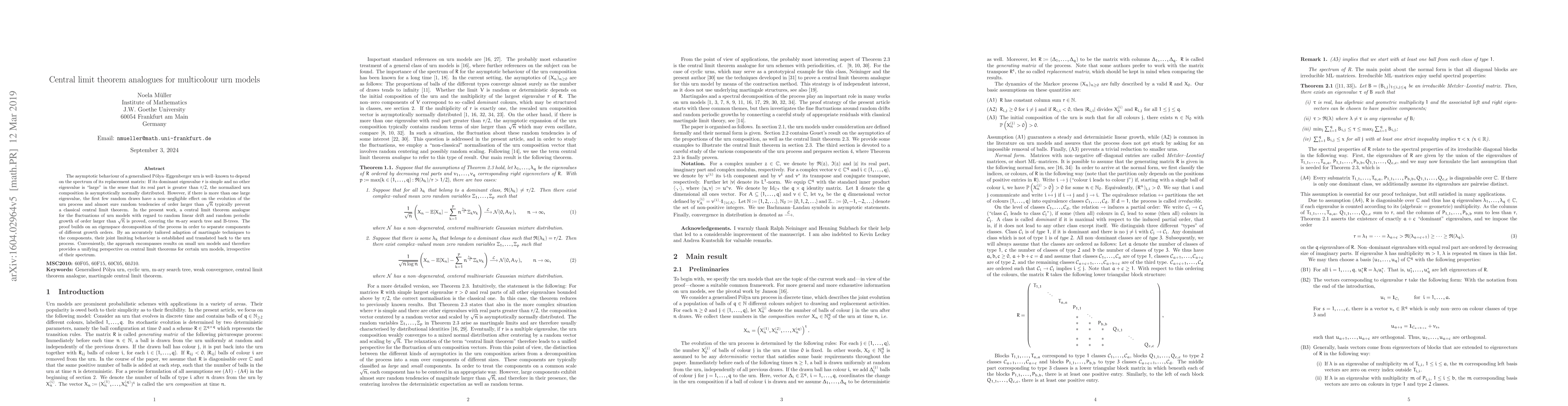 This paper proves a central limit theorem analogue for multicolour urn models, showing that fluctuations can be described by normal distributions even when large eigenvalues affect the process. The proof uses eigenspace decomposition and tailored martingale techniques to handle different growth orders, providing a unifying perspective on urn models.
