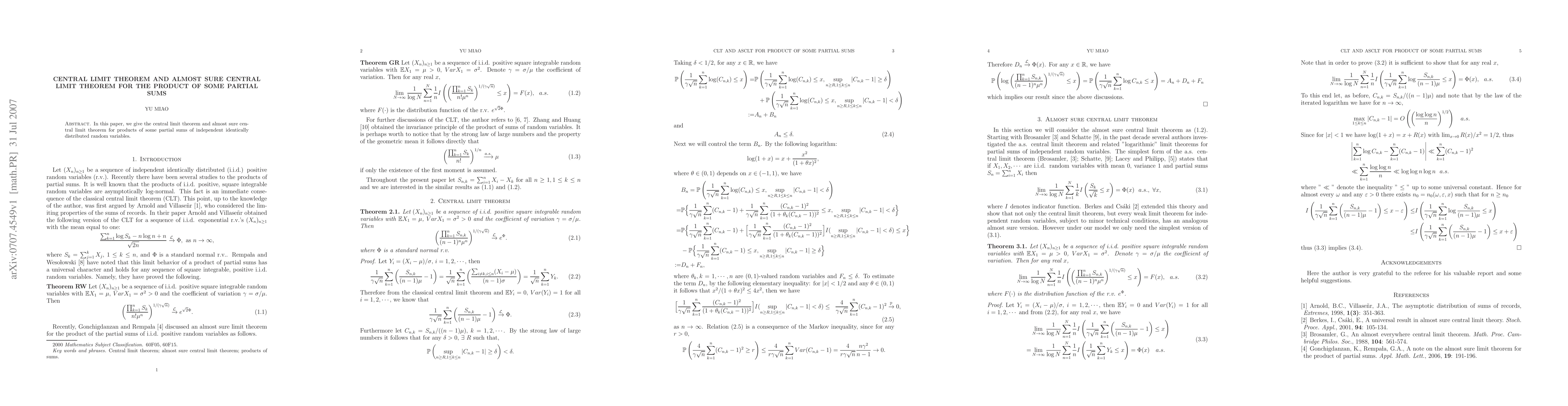Summary: This paper establishes the central limit theorem and the almost sure central limit theorem for products of specific partial sums of independent identically distributed random variables. The findings extend classical limit theorems to more complex product structures.