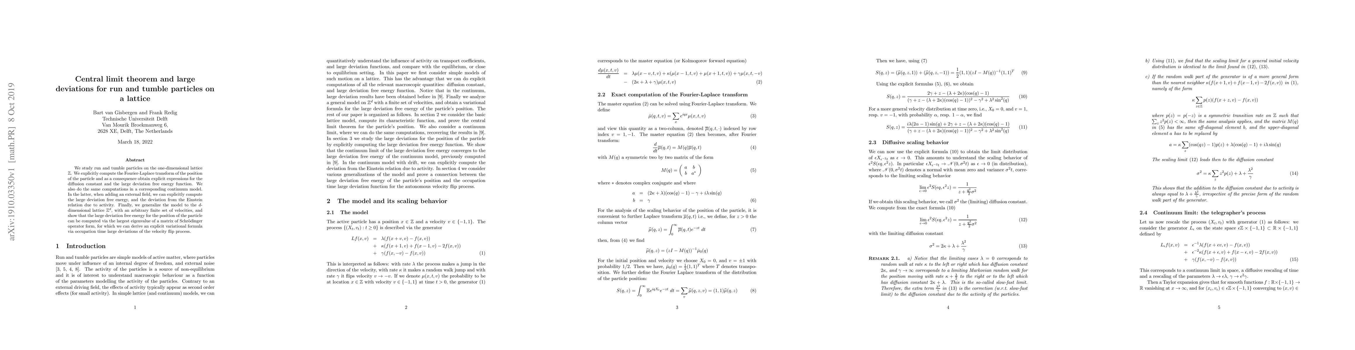 Researchers studied run and tumble particles on a lattice, computing explicit expressions for diffusion constant and large deviation free energy function, which generalizes to d-dimensional lattices with arbitrary velocities.