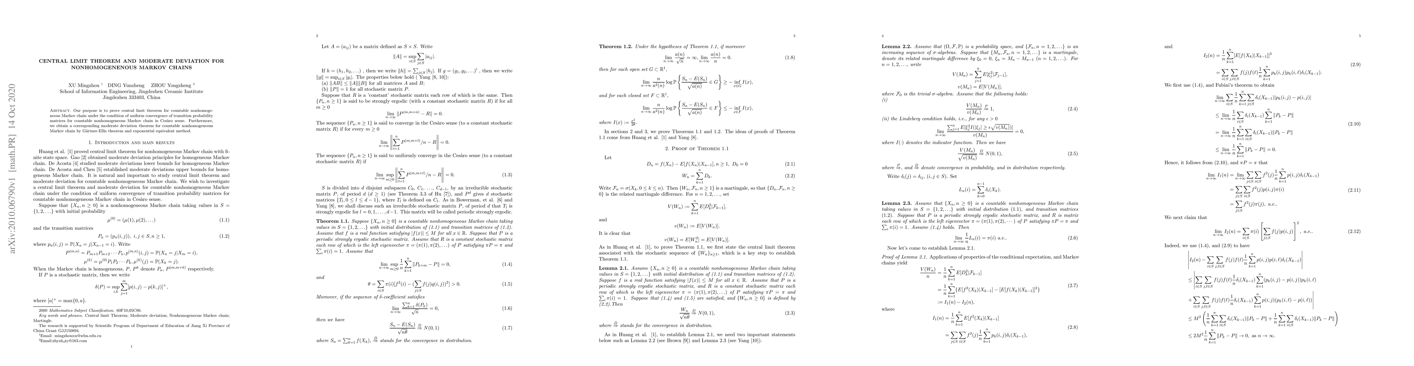 Summary: This paper proves the central limit theorem for countable nonhomogeneous Markov chains under uniform convergence of transition probability matrices. It also establishes a moderate deviation theorem using the Gärtner-Ellis theorem and exponential equivalent method.