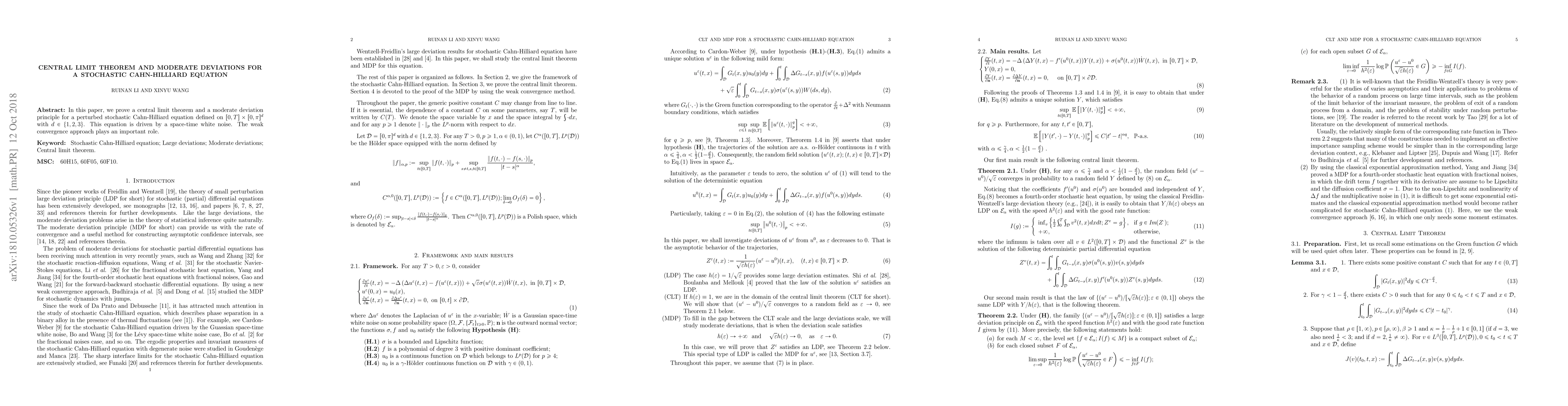 This paper establishes a central limit theorem and a moderate deviation principle for a stochastic Cahn-Hilliard equation driven by space-time white noise, utilizing weak convergence techniques to achieve the results.
