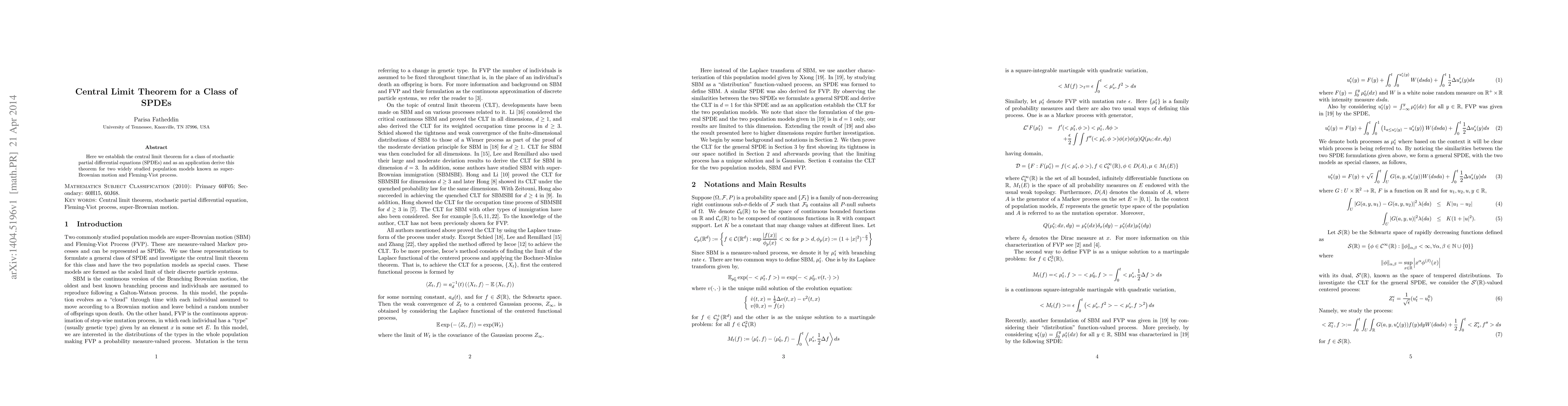 Here we establish the central limit theorem for a class of stochastic partial differential equations (SPDEs) and as an application derive this theorem for two widely studied population models known as super-Brownian motion and Fleming-Viot process.