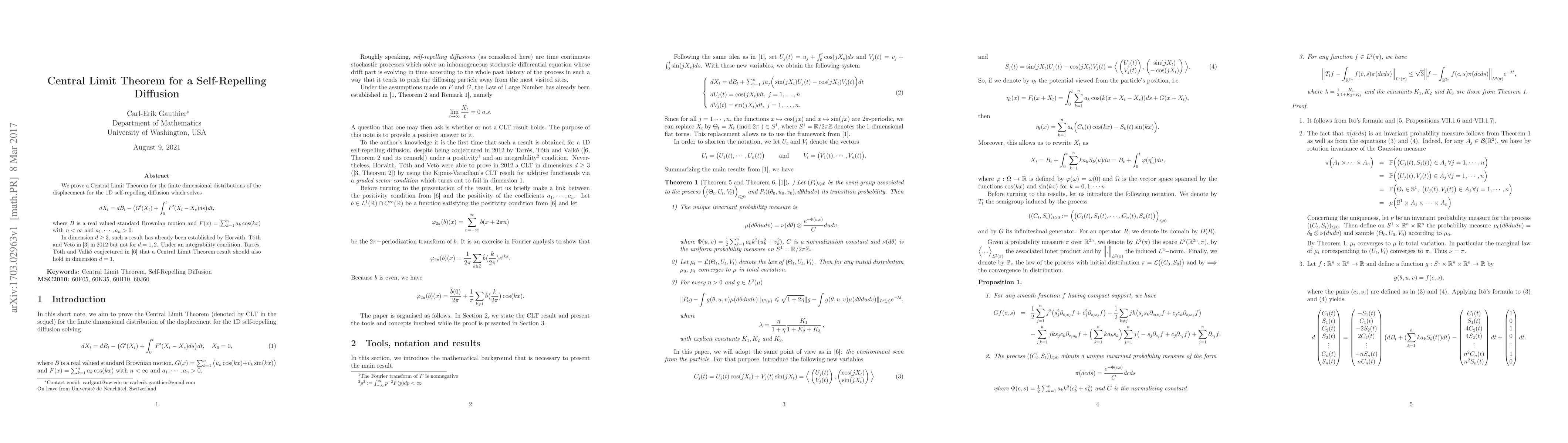 This paper proves a Central Limit Theorem for the finite dimensional distributions of a 1D self-repelling diffusion, extending previous results established in higher dimensions to one and two dimensions. The diffusion is driven by a standard Brownian motion and includes a self-repelling term.