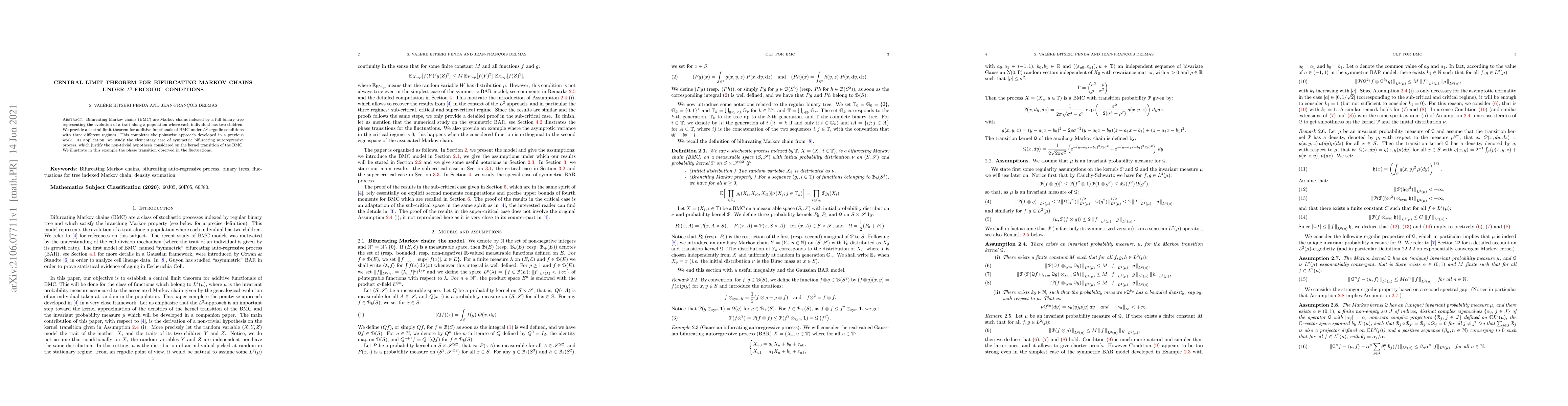 Summary: The paper establishes a central limit theorem for additive functionals of bifurcating Markov chains under $L^{2}$-ergodic conditions, categorizing results into three regimes. It applies these findings to symmetric bifurcating autoregressive processes to demonstrate the validity of the assumptions made and highlights the observed phase transitions in fluctuations.