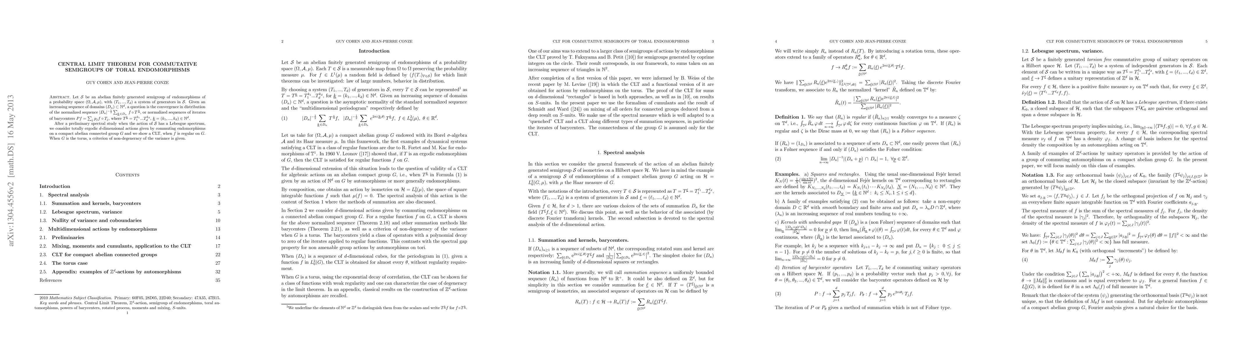 Let $\Cal S$ be an abelian finitely generated semigroup of endomorphisms of a probability space $(\Omega, {\Cal A}, \mu)$, with $(T_1, ..., T_d)$ a system of generators in ${\Cal S}$. Given an increasing sequence of domains $(D_n) \subset \N^d$, a question is the convergence in distribution of the normalized sequence $|D_n|^{-\frac12} \sum_{{\k} \, \in D_n} \, f \circ T^{\,{\k}}$, for $f \in L^2_0(\mu)$, where $T^{\k}= T_1^{k_1} ... T_d^{k_d}$, ${\k}= (k_1, ..., k_d) \in {\N}^d$. After a preliminary spectral study when the action of $\Cal S$ has a Lebesgue spectrum, we consider $\N^d$- or $\Z^d$-actions given by commuting toral automorphisms or endomorphisms on $\T^\rho$, $\rho \geq 1$. For a totally ergodic action by automorphisms, we show a CLT for the above normalized sequence or other summation methods like barycenters, as well as a criterion of non-degeneracy of the variance, when $f$ is regular on the torus. A CLT is also proved for some semigroups of endomorphisms. Classical results on the existence and the construction of such actions by automorphisms are recalled.