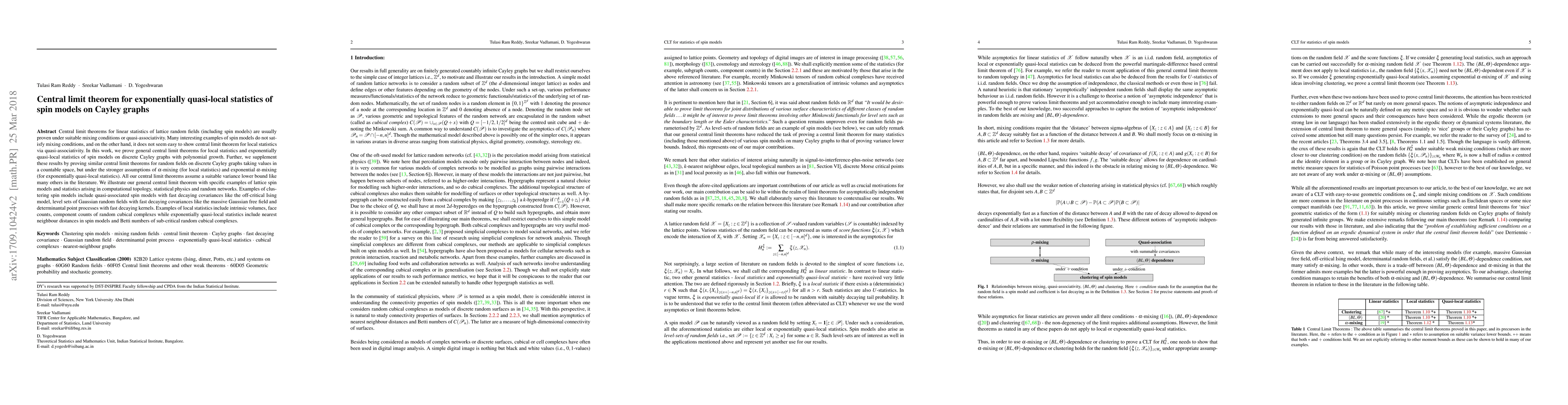 This paper proves central limit theorems for local and exponentially quasi-local statistics of spin models on Cayley graphs, extending beyond traditional mixing conditions. It also applies these results to random fields on discrete Cayley graphs under stronger mixing assumptions, illustrating with examples from computational topology, statistical physics, and random networks.