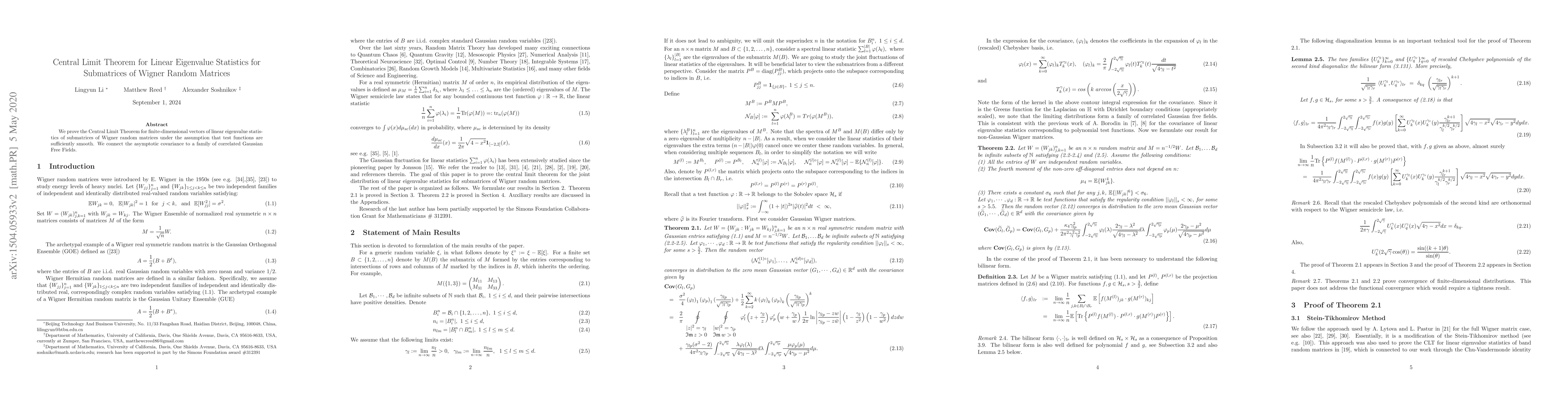 Summary: This paper proves the Central Limit Theorem for linear eigenvalue statistics of submatrices of Wigner random matrices, showing that these statistics converge to a Gaussian distribution, and relates their asymptotic covariance to a family of correlated Gaussian Free Fields.