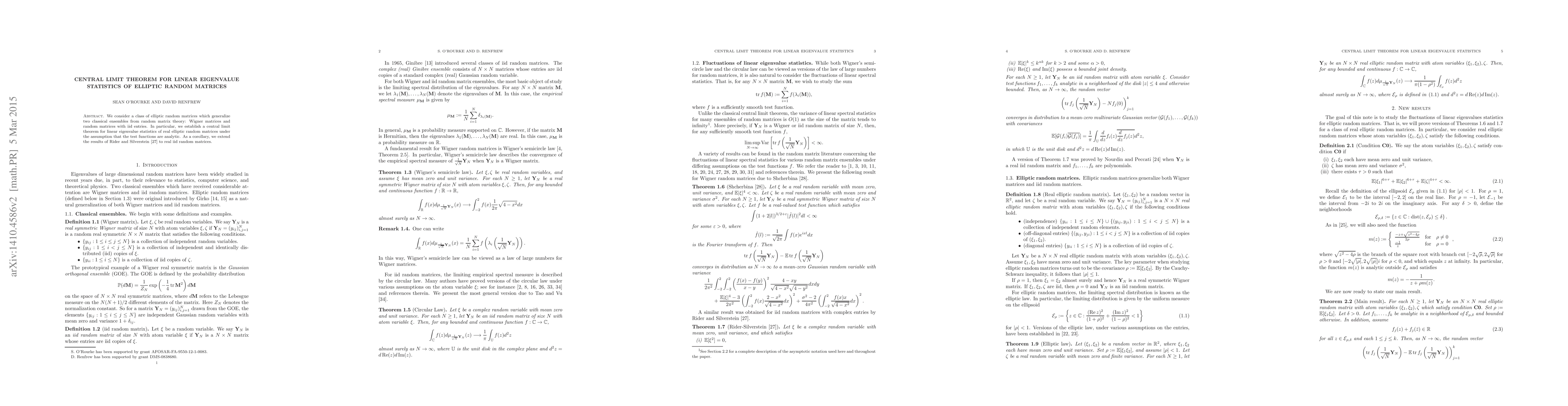 Summary: This paper establishes a central limit theorem for linear eigenvalue statistics of elliptic random matrices, generalizing results from Wigner matrices and iid random matrices, and extends findings for real iid random matrices. The proof assumes analytic test functions.