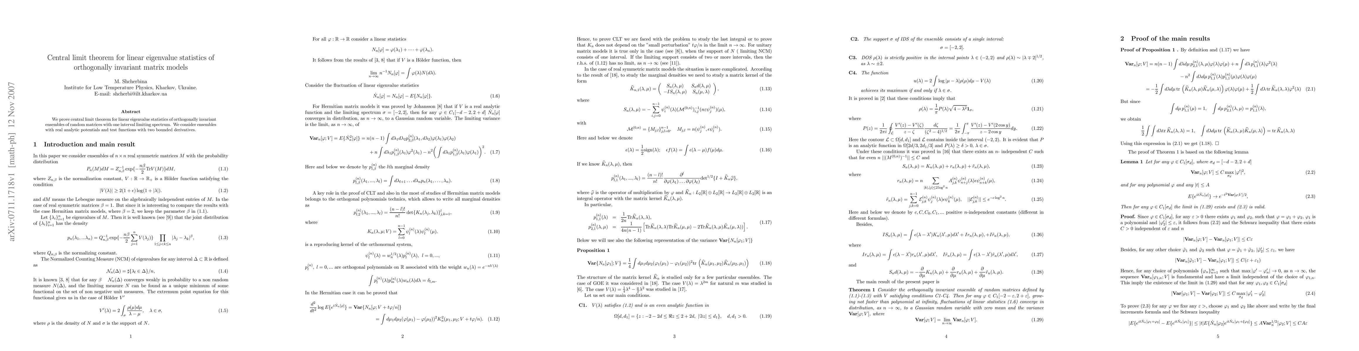 This paper proves the central limit theorem for linear eigenvalue statistics in orthogonally invariant random matrix ensembles with one-interval limiting spectrum, focusing on real analytic potentials and test functions with two bounded derivatives. The result demonstrates the convergence of these statistics to a normal distribution as the matrix size grows.