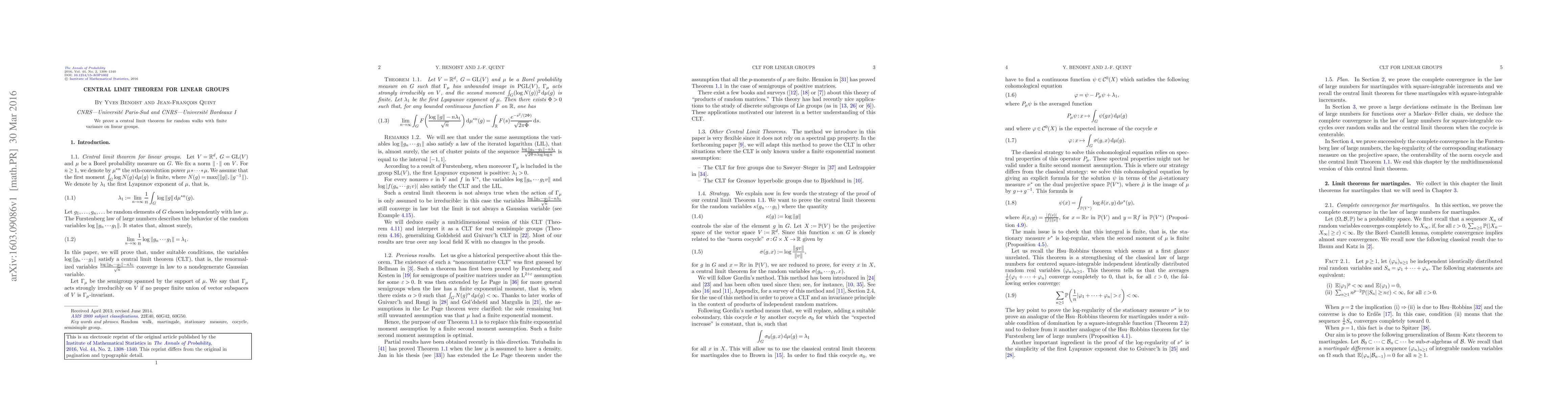 Summary: This paper establishes a central limit theorem for random walks with finite variance on linear groups, demonstrating convergence to a normal distribution. The findings extend classical results to non-abelian settings.