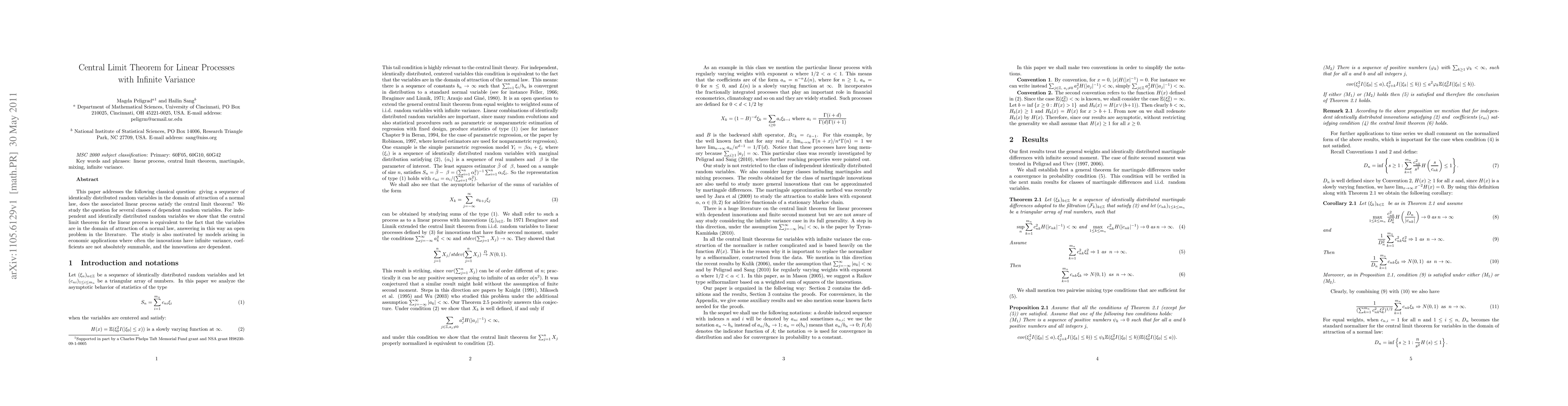 This paper investigates the central limit theorem for linear processes with infinite variance, proving that for independent and identically distributed random variables, the theorem holds if the variables are in the domain of attraction of a normal law, thus resolving an open problem. It also considers applications in economics where innovations often have infinite variance and are dependent.