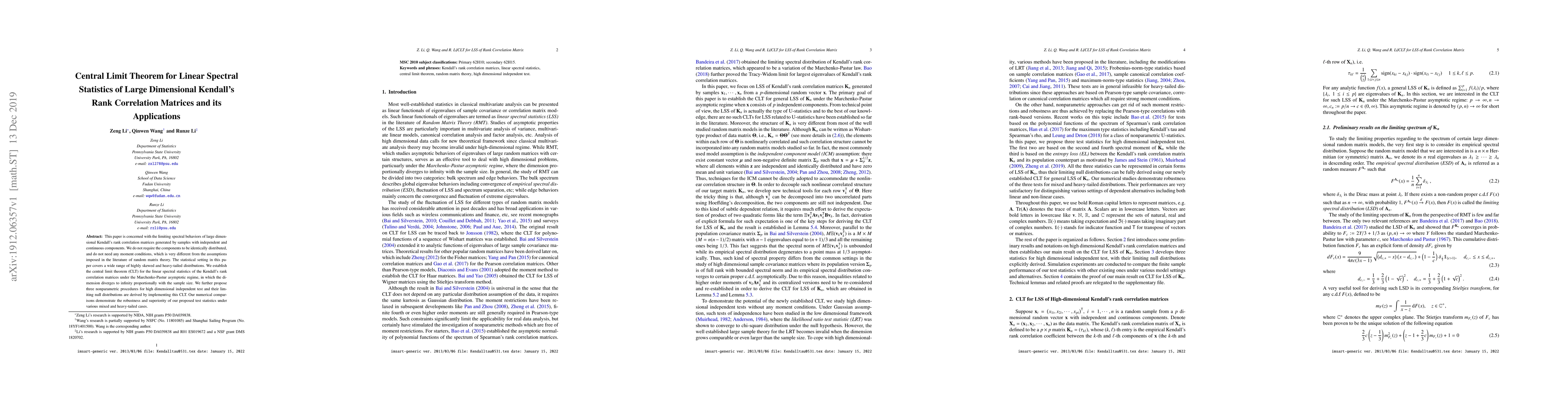This paper establishes a central limit theorem for linear spectral statistics of large dimensional Kendall's rank correlation matrices, without requiring identical distributions or moment conditions. It proposes three nonparametric tests for high-dimensional independence, demonstrating robustness under mixed and heavy-tailed distributions.