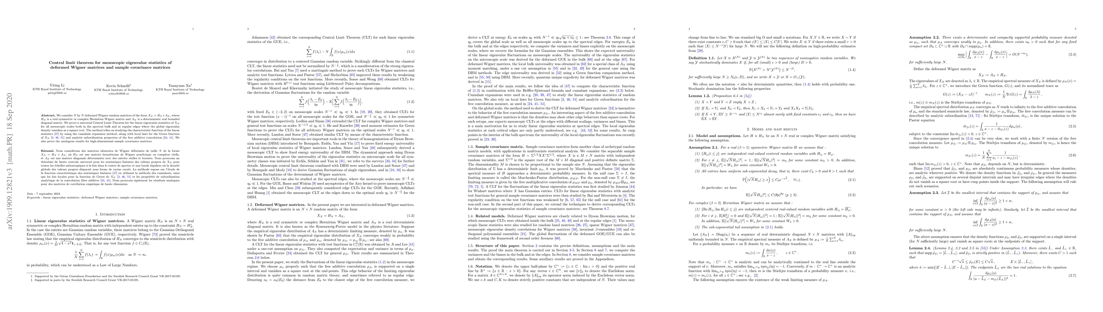 We consider $N$ by $N$ deformed Wigner random matrices of the form $X_N=H_N+A_N$, where $H_N$ is a real symmetric or complex Hermitian Wigner matrix and $A_N$ is a deterministic real bounded diagonal matrix. We prove a universal Central Limit Theorem for the linear eigenvalue statistics of $X_N$ for all mesoscopic scales both in the spectral bulk and at regular edges where the global eigenvalue density vanishes as a square root. The method relies on the characteristic function method in [47], local laws for the Green function of $X_N$ in [3, 46, 51] and analytic subordination properties of the free additive convolution [24, 41]. We also prove the analogous results for high-dimensional sample covariance matrices.