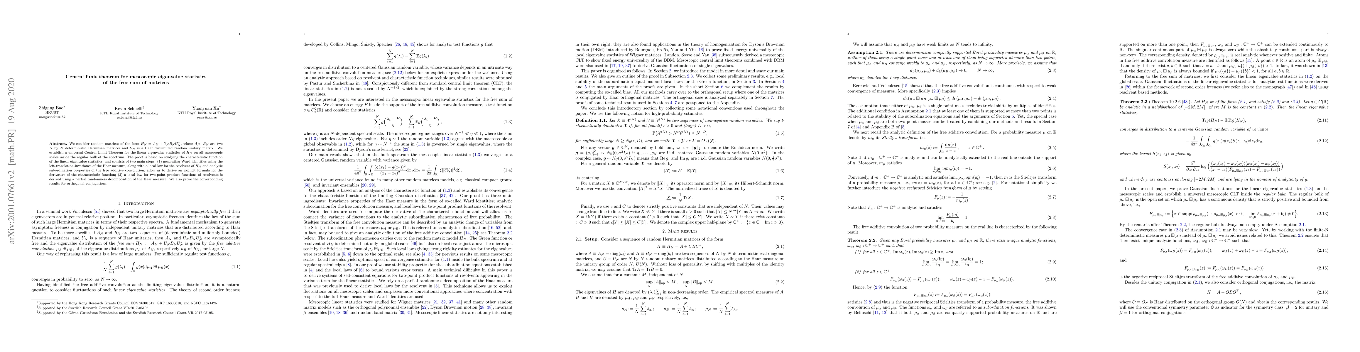 We consider random matrices of the form $H_N=A_N+U_N B_N U^*_N$, where $A_N$, $B_N$ are two $N$ by $N$ deterministic Hermitian matrices and $U_N$ is a Haar distributed random unitary matrix. We establish a universal Central Limit Theorem for the linear eigenvalue statistics of $H_N$ on all mesoscopic scales inside the regular bulk of the spectrum. The proof is based on studying the characteristic function of the linear eigenvalue statistics, and consists of two main steps: (1) generating Ward identities using the left-translation-invariance of the Haar measure, along with a local law for the resolvent of $H_N$ and analytic subordination properties of the free additive convolution, allow us to derive an explicit formula for the derivative of the characteristic function; (2) a local law for two-point product functions of resolvents is derived using a partial randomness decomposition of the Haar measure. We also prove the corresponding results for orthogonal conjugations.