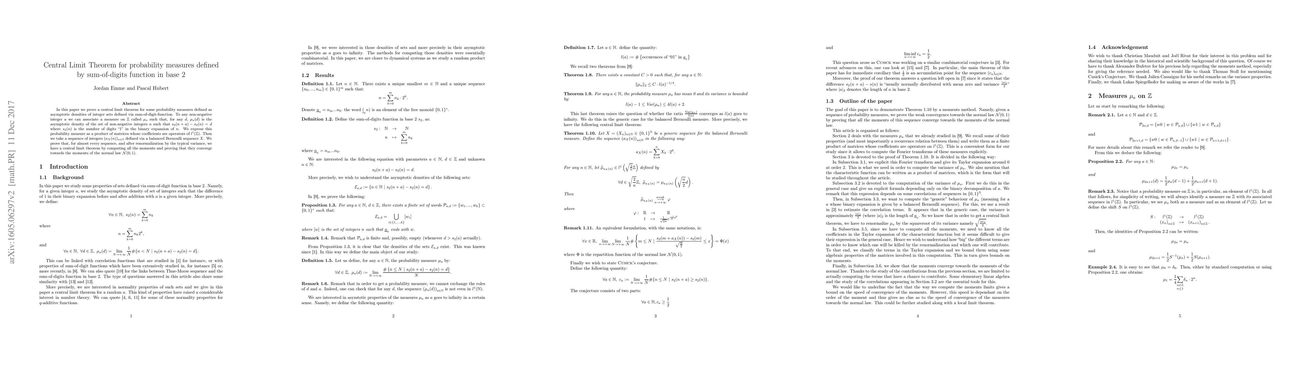 This paper proves a central limit theorem for probability measures defined by sum-of-digits functions in base 2, showing that sequences of integers converge to the normal distribution after renormalization.