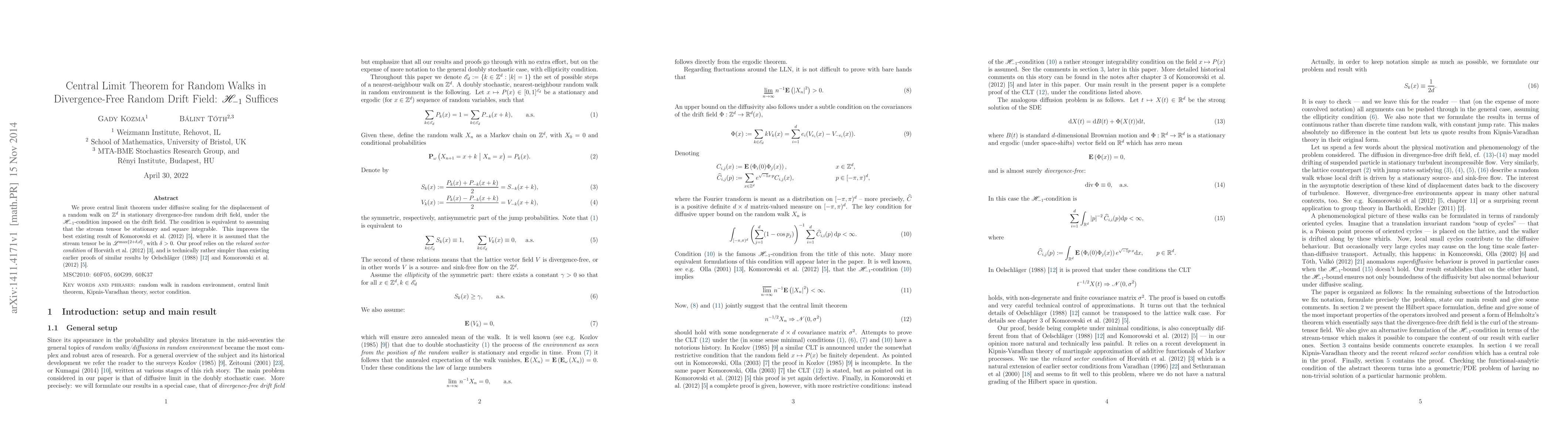 We prove central limit theorem under diffusive scaling for the displacement of a random walk on ${\mathbb Z}^d$ in stationary divergence-free random drift field, under the ${\mathcal H}_{-1}$-condition imposed on the drift field. The condition is equivalent to assuming that the stream tensor be stationary and square integrable. This improves the best existing result of Komorowski, Landim and Olla (2012), where it is assumed that the stream tensor be in ${\mathcal L}^{\max\{2+\delta,d\}}$, with $\delta>0$. Our proof relies on the relaxed sector condition of Horv\'ath, T\'oth and Vet\H{o} (2012), and is technically rather simpler than existing earlier proofs of similar results by Oelschl\"ager (1988) and Komorowski, Landim, Olla (2012).