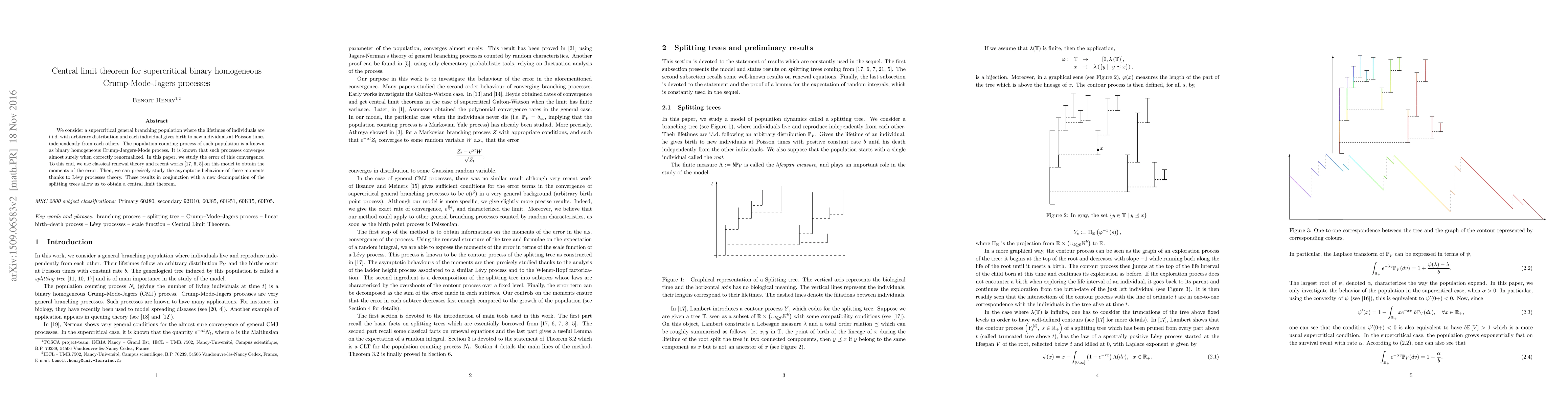 We consider a supercritical general branching population where the lifetimes of individuals are i.i.d. with arbitrary distribution and each individual gives birth to new individuals at Poisson times independently from each others. The population counting process of such population is a known as binary homogeneous Crump-Jargers-Mode process. It is known that such processes converges almost surely when correctly renormalized. In this paper, we study the error of this convergence. To this end, we use classical renewal theory and recent works [17, 6, 5] on this model to obtain the moments of the error. Then, we can precisely study the asymptotic behaviour of these moments thanks to L{\'e}vy processes theory. These results in conjunction with a new decomposition of the splitting trees allow us to obtain a central limit theorem. MSC 2000 subject classifications: Primary 60J80; secondary 92D10, 60J85, 60G51, 60K15, 60F05.
