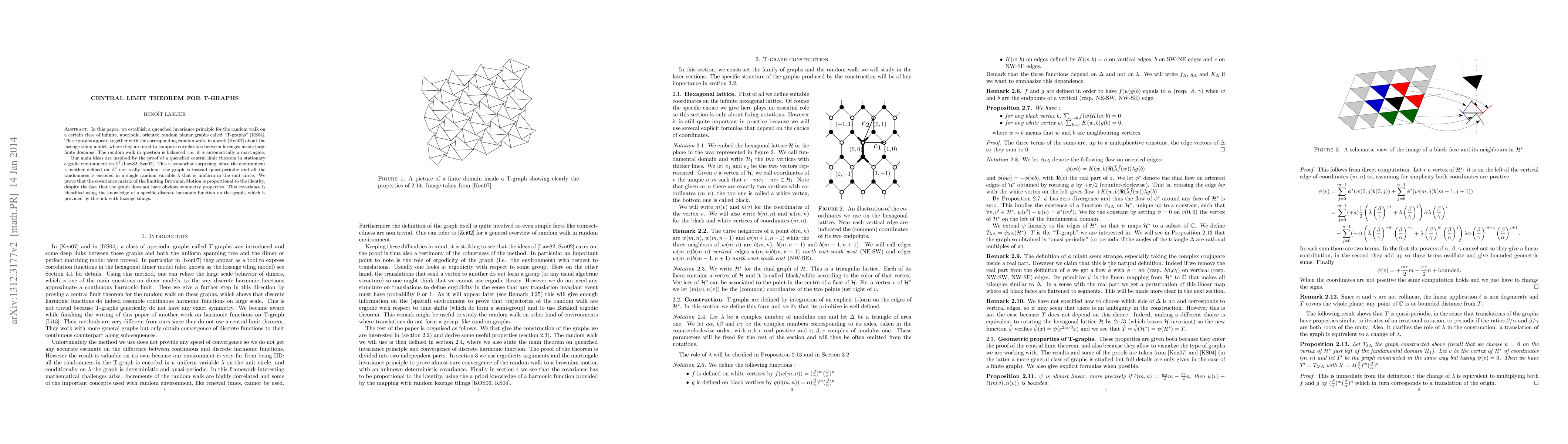 In this paper, we establish a quenched invariance principle for the random walk on a certain class of infinite, aperiodic, oriented random planar graphs called "T-graphs" [Kenyon-Sheffield04]. These graphs appear, together with the corresponding random walk, in a work [Kenyon07] about the lozenge tiling model, where they are used to compute correlations between lozenges inside large finite domains. The random walk in question is balanced, i.e. it is automatically a martingale. Our main ideas are inspired by the proof of a quenched central limit theorem in stationary ergodic environment on $\mathbb{Z}^2$ [Lawler82, Sznitman02]. This is somewhat surprising, since the environment is neither defined on $\mathbb{Z}^2$ nor really random: the graph is instead quasi-periodic and all the randomness is encoded in a single random variable {\lambda} that is uniform in the unit circle. We prove that the covariance matrix of the limiting Brownian Motion is proportional to the identity, despite the fact that the graph does not have obvious symmetry properties. This covariance is identified using the knowledge of a specific discrete harmonic function on the graph, which is provided by the link with lozenge tilings.