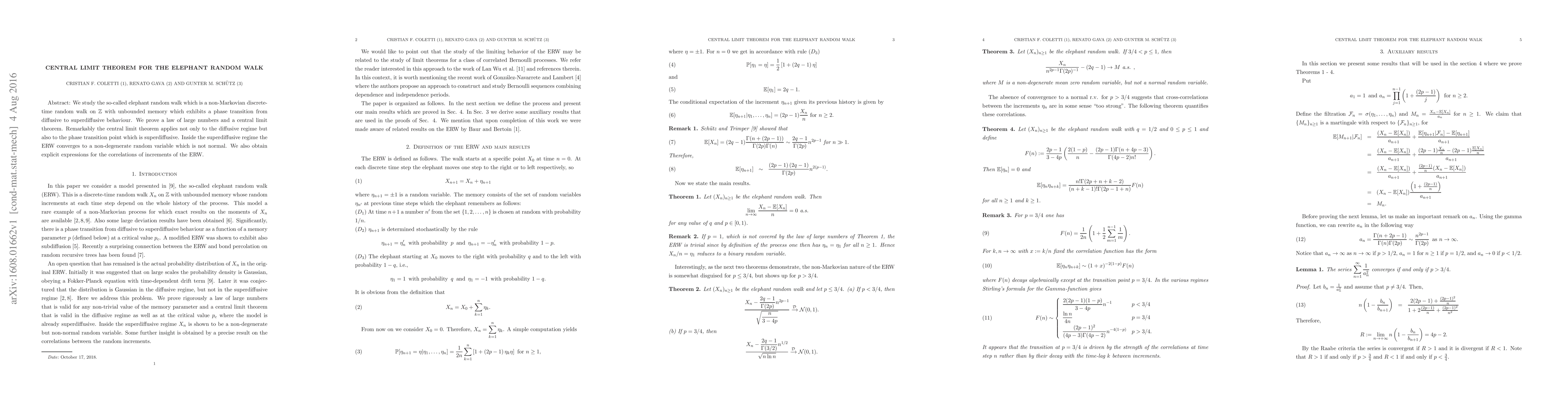 This paper investigates the elephant random walk (ERW), a non-Markovian random walk with unbounded memory, demonstrating a phase transition from diffusive to superdiffusive behavior. It proves a central limit theorem applicable across regimes, including the superdiffusive phase, where the ERW converges to a non-normal random variable.