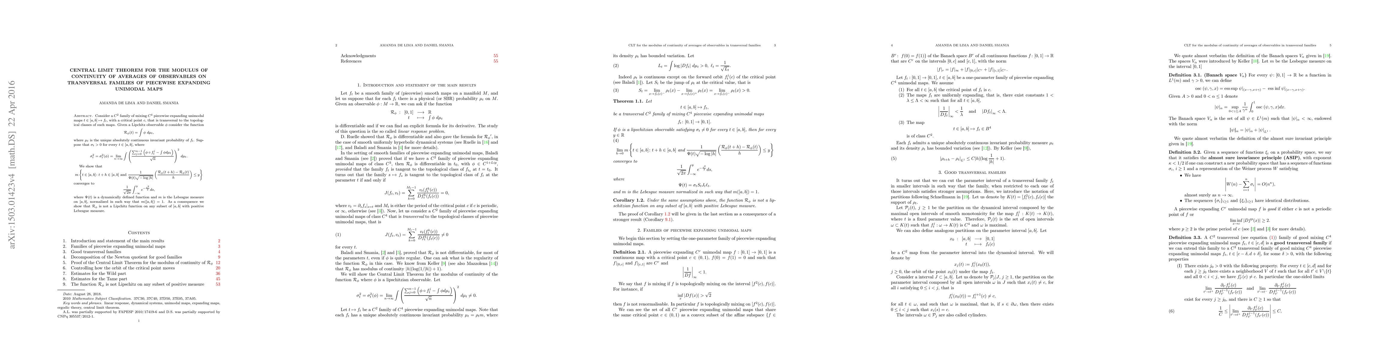 We prove that the Newton quotient of the average R(t) of a lipschitzian function (with non vanishing variation) with respect to the SRB measure on a transversal family f_t of piecewise expanding unimodal maps, after an appropriated normalization, converges in distribution to the normal distribution.