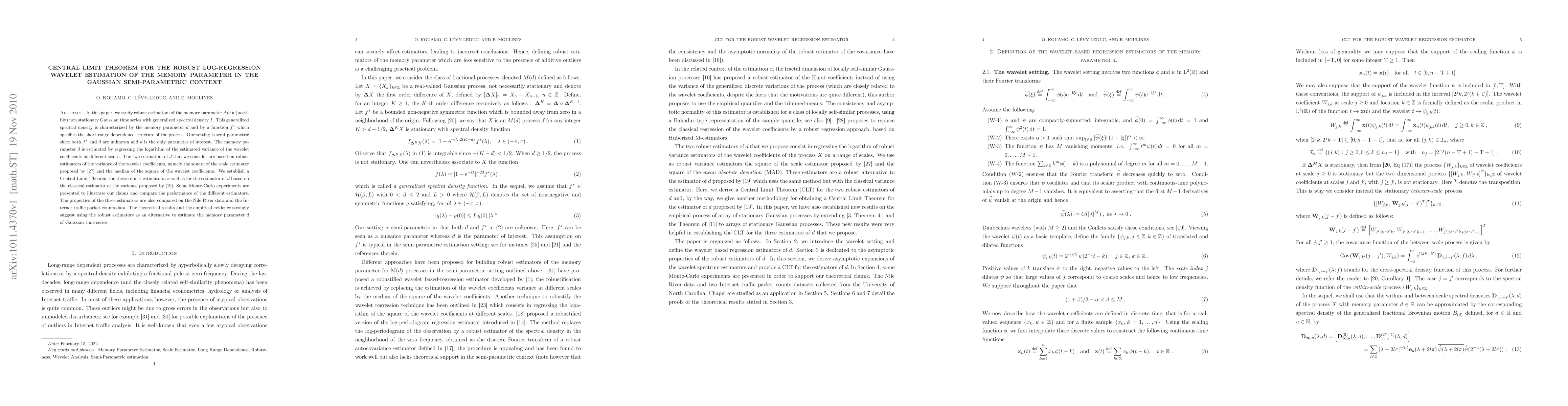 This paper presents a robust method for estimating the memory parameter in Gaussian time series using wavelet regression, providing an alternative to classical estimators.