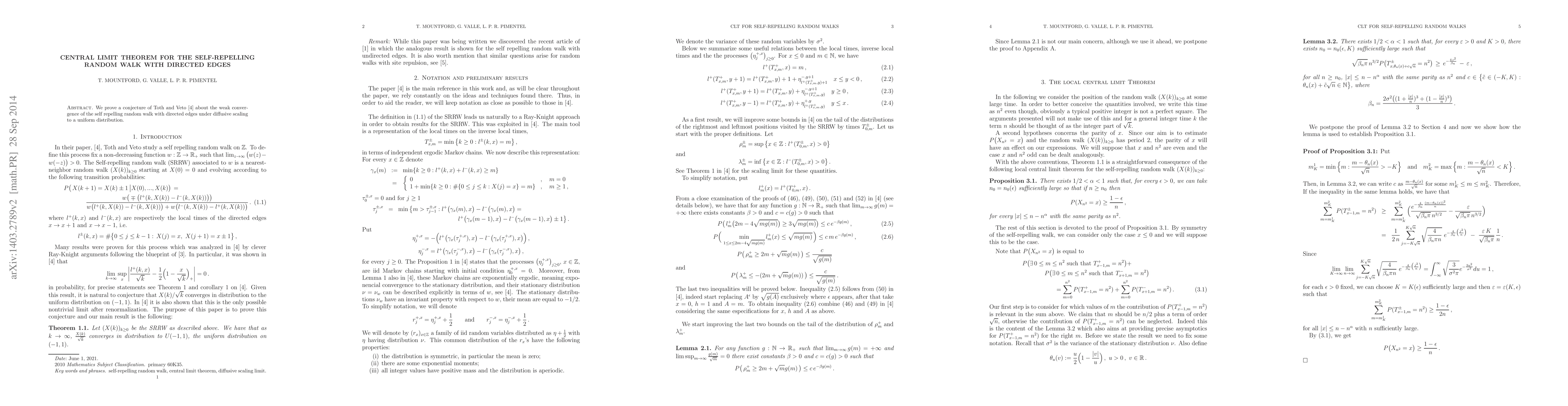 Summary: This paper proves the conjecture by Toth and Veto regarding the weak convergence of self-repelling random walks with directed edges, showing they converge under diffusive scaling to a uniform distribution. The central limit theorem is established for this stochastic process.