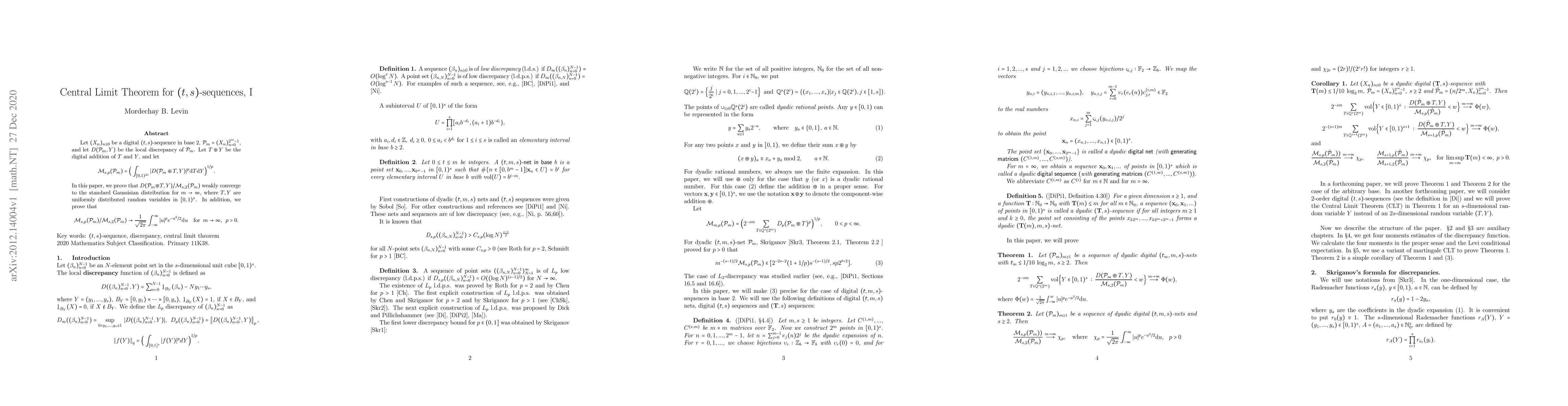 Let $ (X_n)_{n \geq 0} $ be a digital $(t,s)$-sequence in base $2$, $\mathcal{P}_m =(X_n)_{n=0}^{2^m-1} $, and let $D(\mathcal{P}_m, Y )$ be the local discrepancy of $\mathcal{P}_m$. Let $T \oplus Y$ be the digital addition of $T$ and $Y$, and let $$\mathcal{M}_{s,p} (\mathcal{P}_m) =\Big( \int_{[0,1)^{2s}} |D(\mathcal{P}_m \oplus T , Y ) |^p \mathrm{d}T \mathrm{d}Y \Big)^{1/p} .$$ In this paper, we prove that $D(\mathcal{P}_m \oplus T , Y ) / \mathcal{M}_{s,2} (\mathcal{P}_m)$ weakly converge to the standard Gaussisian distribution for $m \rightarrow \infty$, where $T,Y$ are uniformly distributed random variables in $[0,1)^s$. In addition, we prove that \begin{equation} \nonumber \mathcal{M}_{s,p} (\mathcal{P}_m) / \mathcal{M}_{s,2} (\mathcal{P}_m) \to \frac{1}{\sqrt{2\pi}}\int_{-\infty}^{\infty} |u|^p e^{-u^2/2} \mathrm{d}u \quad {\rm for} \; \; m \to \infty , \;\; p>0. \end{equation}