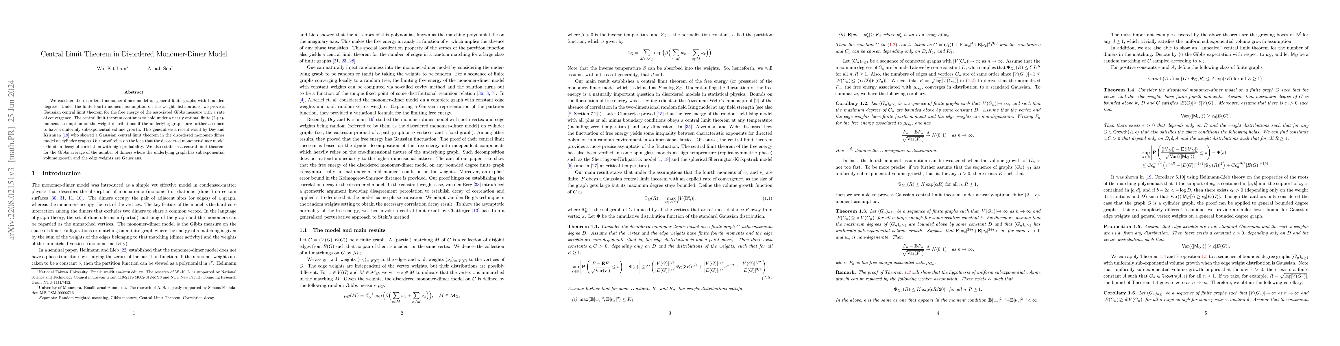 This paper proves a central limit theorem for the free energy of the disordered monomer-dimer model on finite graphs with bounded degrees, showing Gaussian convergence under bounded fourth moment assumptions. It extends the result to nearly optimal finite $(2+\epsilon)$-moment conditions under uniformly subexponential volume growth.