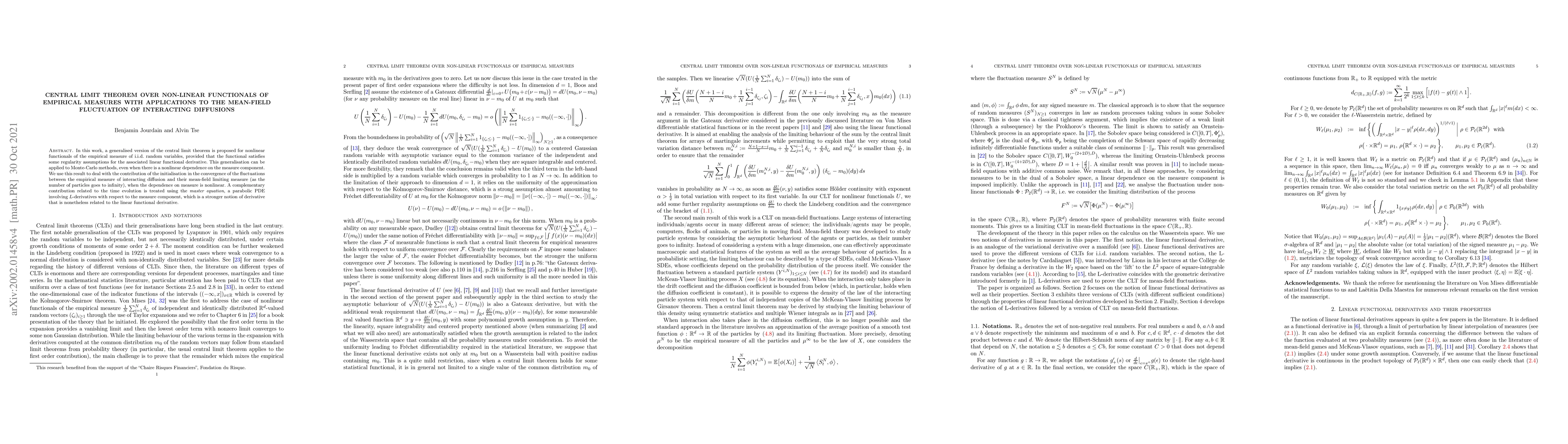 In this work, a generalised version of the central limit theorem is proposed for nonlinear functionals of the empirical measure of i.i.d. random variables, provided that the functional satisfies some regularity assumptions for the associated linear functional derivative. This generalisation can be applied to Monte-Carlo methods, even when there is a nonlinear dependence on the measure component. We use this result to deal with the contribution of the initialisation in the convergence of the fluctuations between the empirical measure of interacting diffusion and their mean-field limiting measure (as the number of particles goes to infinity), when the dependence on measure is nonlinear. A complementary contribution related to the time evolution is treated using the master equation, a parabolic PDE involving L-derivatives with respect to the measure component, which is a stronger notion of derivative that is nonetheless related to the linear functional derivative.
