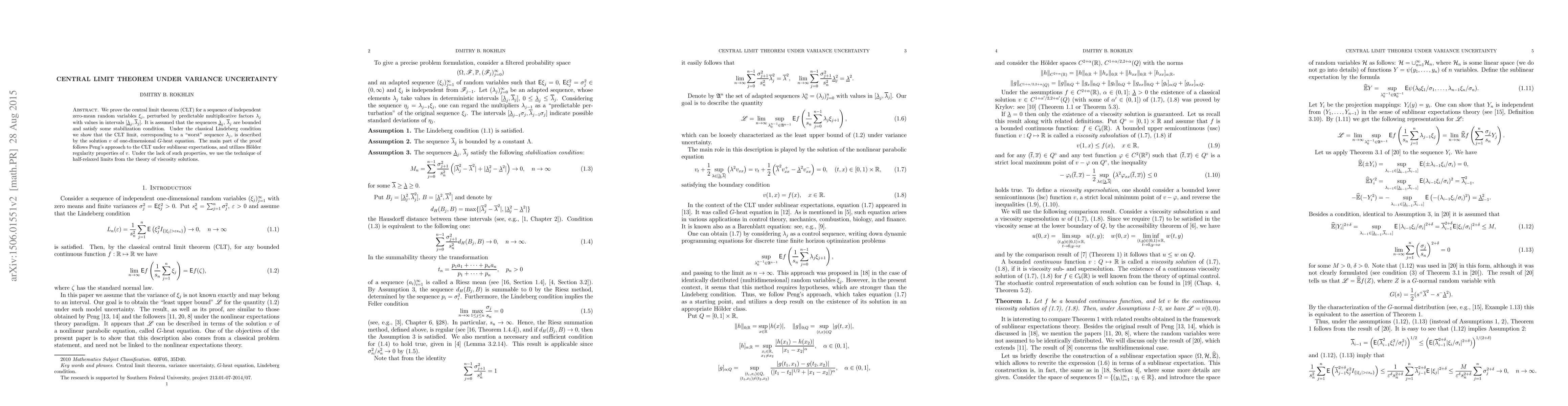 We prove the central limit theorem (CLT) for a sequence of independent zero-mean random variables $\xi_j$, perturbed by predictable multiplicative factors $\lambda_j$ with values in intervals $[\underline\lambda_j,\overline\lambda_j]$. It is assumed that the sequences $\underline\lambda_j$, $\overline\lambda_j$ are bounded and satisfy some stabilization condition. Under the classical Lindeberg condition we show that the CLT limit, corresponding to a "worst" sequence $\lambda_j$, is described by the solution $v$ of one-dimensional $G$-heat equation. The main part of the proof follows Peng's approach to the CLT under sublinear expectations, and utilizes H\"{o}lder regularity properties of $v$. Under the lack of such properties, we use the technique of half-relaxed limits from the theory of viscosity solutions.