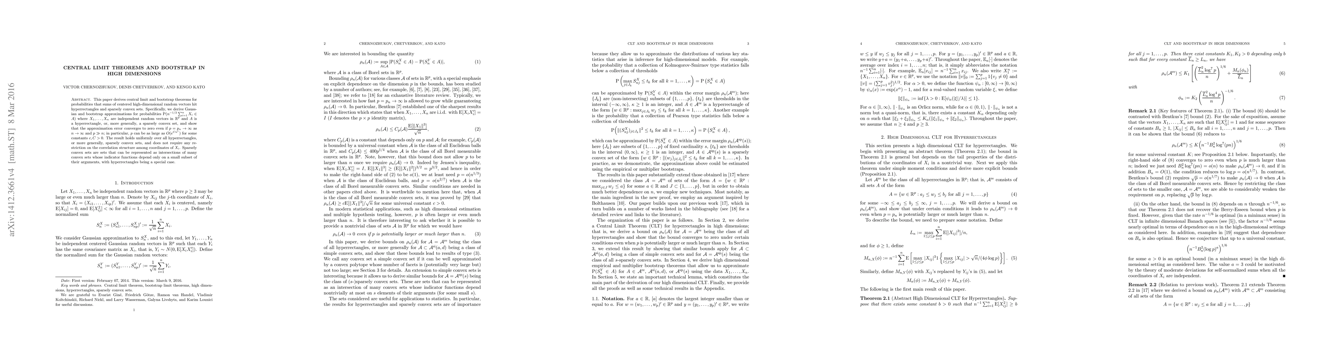This paper establishes central limit and bootstrap theorems for high-dimensional random vectors, showing Gaussian and bootstrap approximations for sums hitting hyperrectangles or sparsely convex sets. The approximation error converges to zero even when the dimension grows exponentially with the sample size.