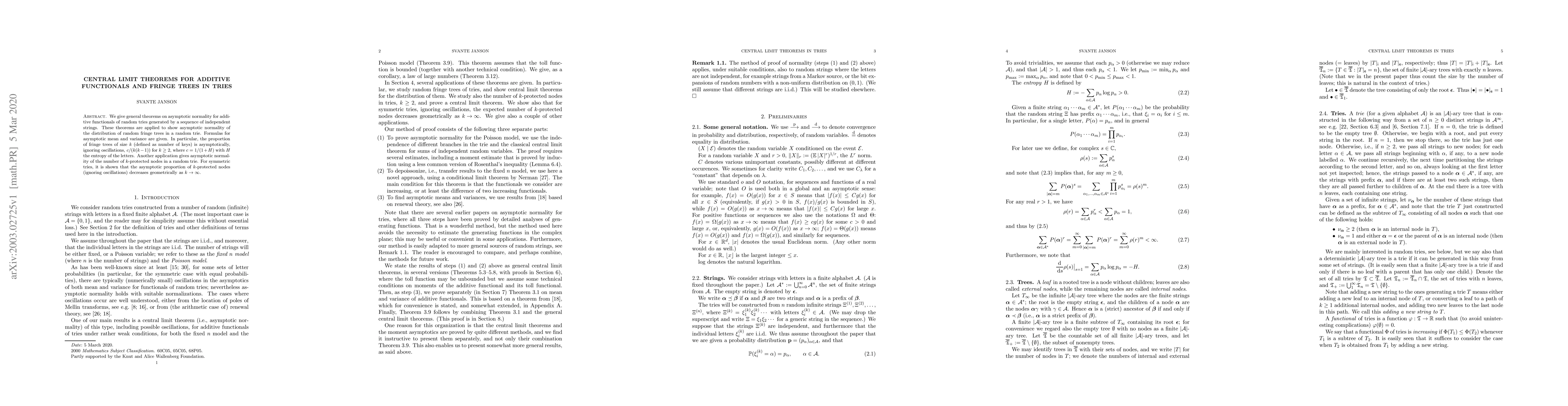 This paper presents central limit theorems for additive functionals in random tries, demonstrating asymptotic normality of fringe trees and $k$-protected nodes. It provides formulas for their mean and variance, showing that fringe tree proportions follow a specific pattern and that protected node proportions decrease geometrically for symmetric tries.