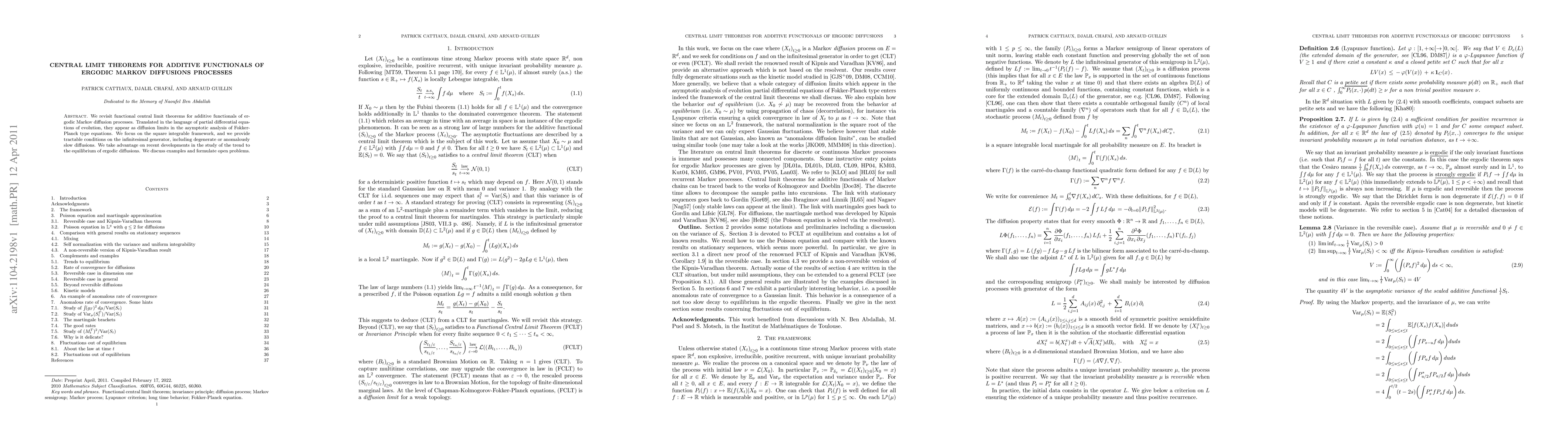 This paper explores central limit theorems for additive functionals in ergodic Markov diffusion processes, framed within the context of Fokker-Planck equations. It provides conditions for square-integrable frameworks and discusses degenerate or anomalous diffusions, leveraging recent advancements in diffusion equilibrium analysis.