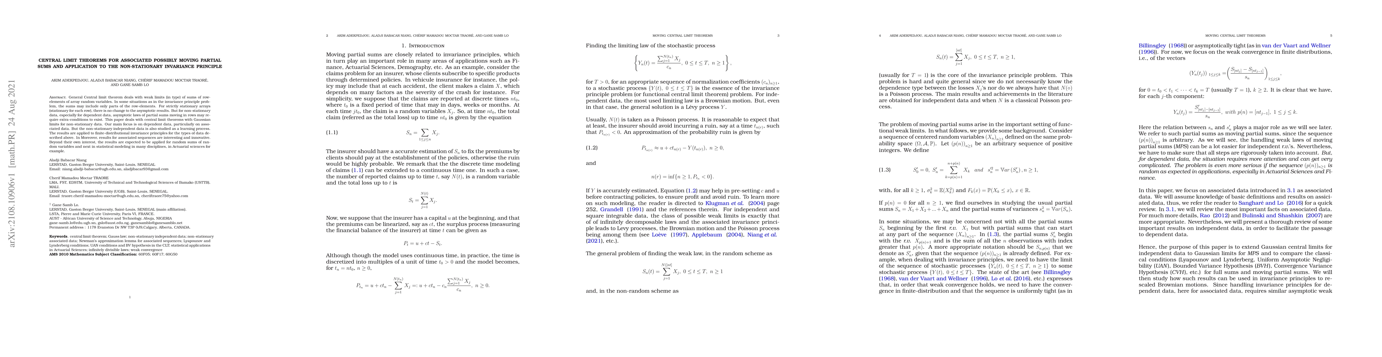 General Central limit theorem deals with weak limits (in type) of sums of row-elements of array random variables. In some situations as in the invariance principle problem, the sums may include only parts of the row-elements. For strictly stationary arrays (stationary for each row), there is no change to the asymptotic results. But for non-stationary data, especially for dependent data, asymptotic laws of partial sums moving in rows may require extra-conditions to exist. This paper deals with central limit theorems with Gaussian limits for non-stationary data. Our main focus is on dependent data, particularly on associated data. But the non-stationary independent data is also studied as a learning process. The results are applied to finite-distributional invariance principles for the types of data described above. In Moreover, results for associated sequences are interesting and innovative. Beyond their own interest, the results are expected to be applied for random sums of random variables and next in statistical modeling in many disciplines, in Actuarial sciences for example