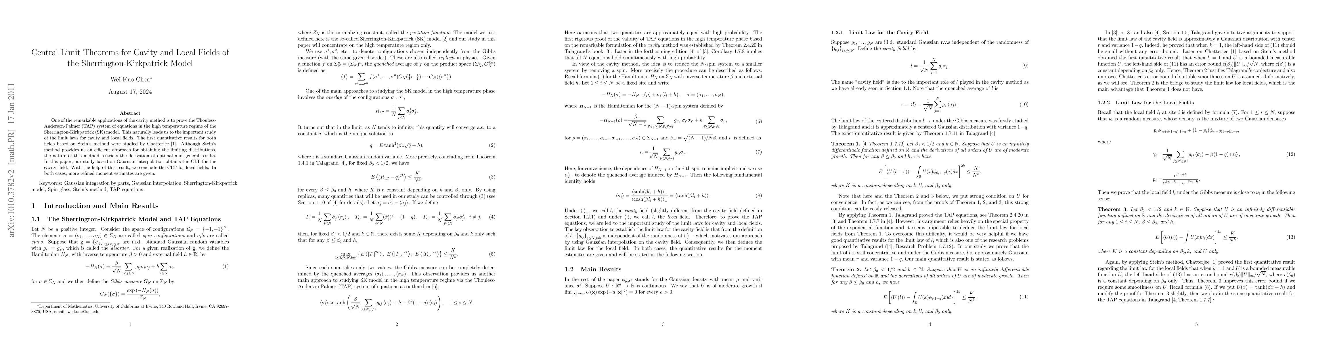 One of the remarkable applications of the cavity method is to prove the Thouless-Anderson-Palmer (TAP) system of equations in the high temperature regime of the Sherrington-Kirkpatrick (SK) model. This naturally leads us to the important study of the limit laws for cavity and local fields. The first quantitative results for both fields based on Stein's method were studied by Chatterjee. Although Stein's method provides us an efficient approach for obtaining the limiting distributions, the nature of this method restricts the derivation of optimal and general results. In this paper, our study based on Gaussian interpolation obtains the CLT for the cavity field. With the help of this result, we conclude the CLT for local fields. In both cases, more refined moment estimates are given.