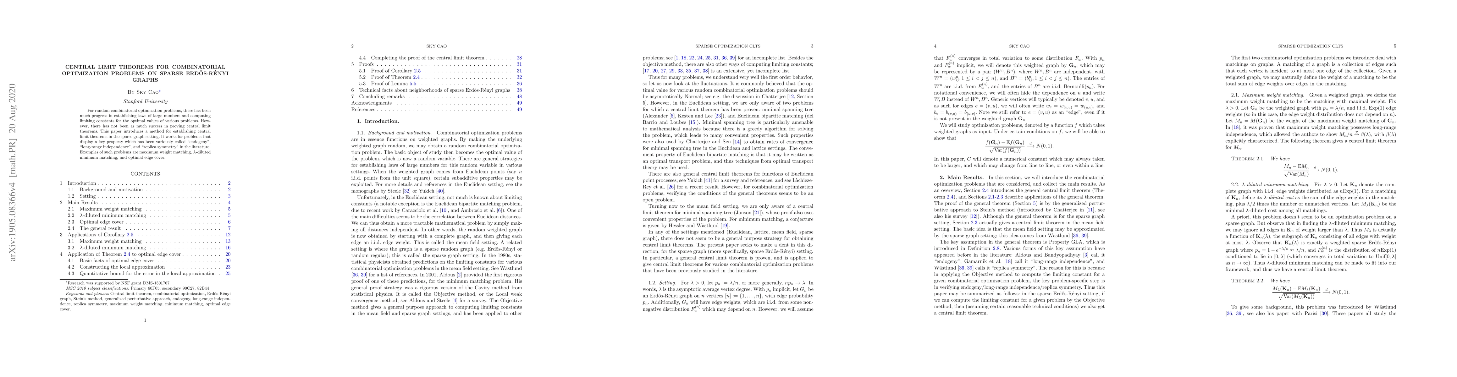 This paper presents a novel method to prove central limit theorems for sparse ErdH{o}s-R'enyi graphs in combinatorial optimization problems. It applies to problems exhibiting 'endogeny', 'long-range independence', or 'replica symmetry', such as maximum weight matching and minimum matching with dilution.